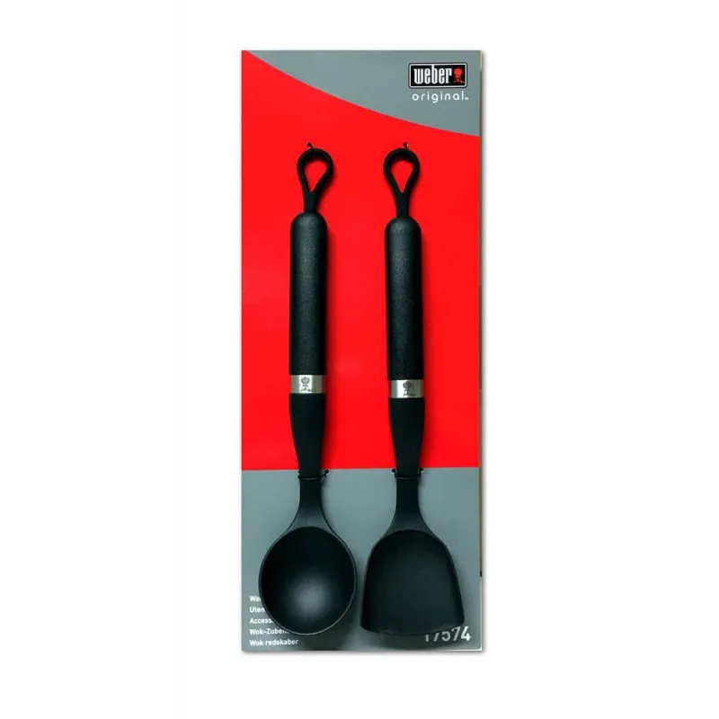 Купить набор из 2-х приборов для сковороды Вок Weber, дерево стоит как новичку, так и профессионалу. Он включает в себя удобные ложку и лопатку, изготовленных из термостойкого нейлона. Некоторые элементы выполнены из нержавеющей стали. Инструменты имеют стильный черный цвет.