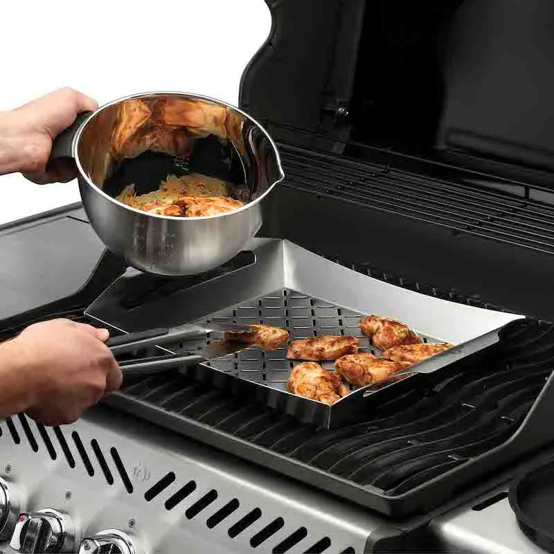 Чаши из нержавеющей стали трех размеров - три практичных и стильных помощника на современной гриль-кухне. Метрические (литры) и британские единицы измерения четко видны изнутри, а герметичные крышки сохраняют свежесть продуктов. С силиконом на ручках и нижней стороне чаши вы можете работать безопасно, а носик для разливки облегчает весь процесс.