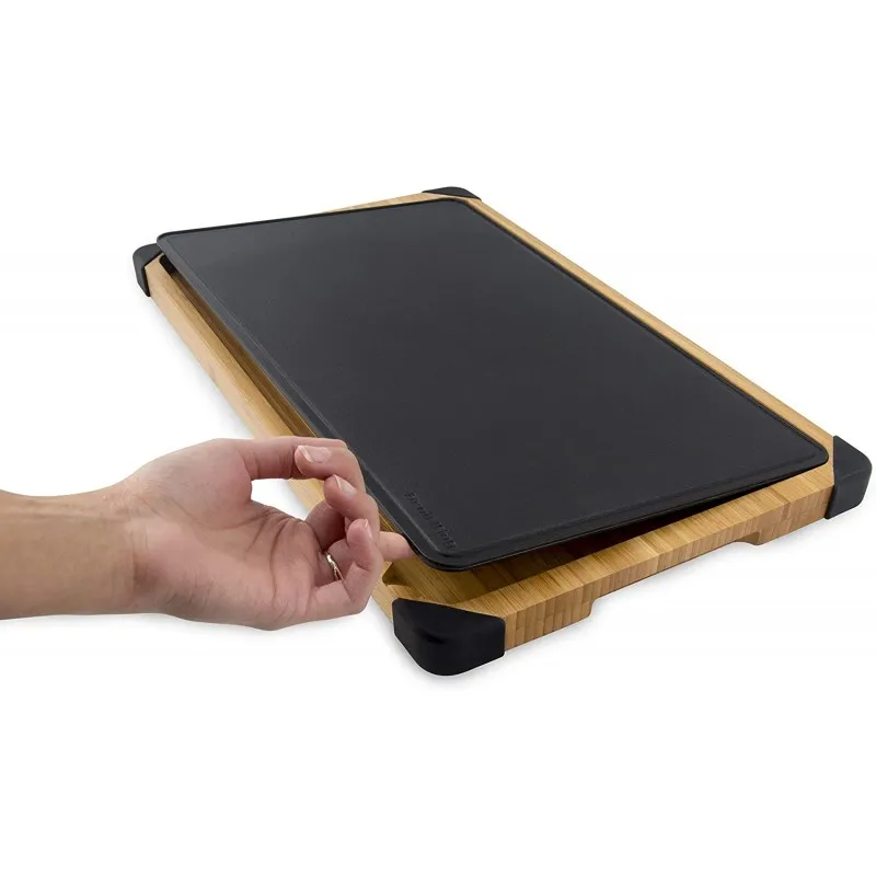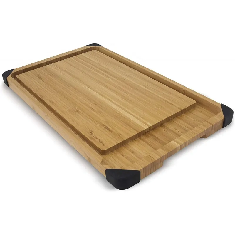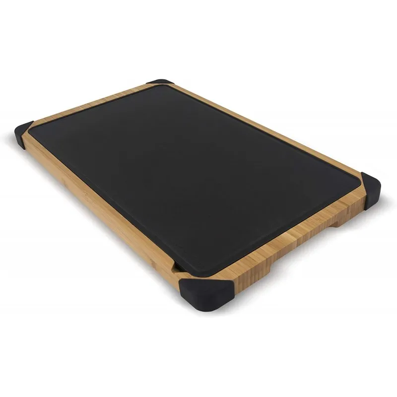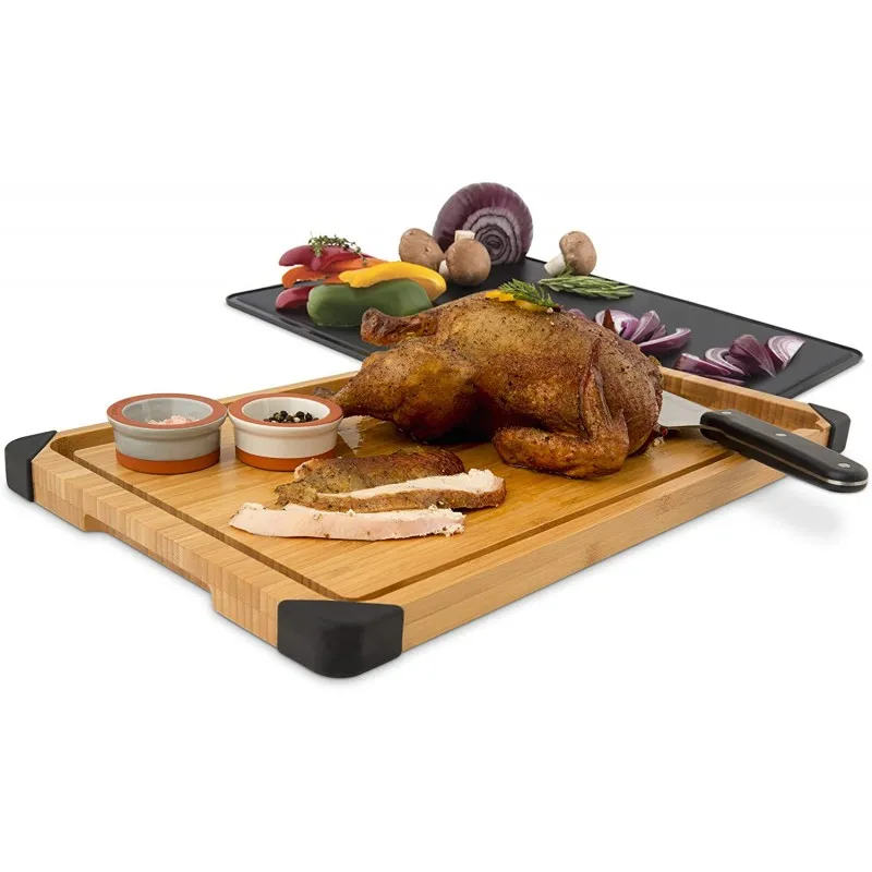 Набор разделочных досок Броил Кинг включает в себя двухстороннюю доску, выполненную из полимеров, подходящую для разделки птицы, рыбы или мяса, и доски, сделанной из бамбука, которую можно использовать для резки овощей или уже приготовленного мяса. При этом, бамбуковая доска, помимо материала изготовления, отличается некоторыми особенностями конструкции, включая: