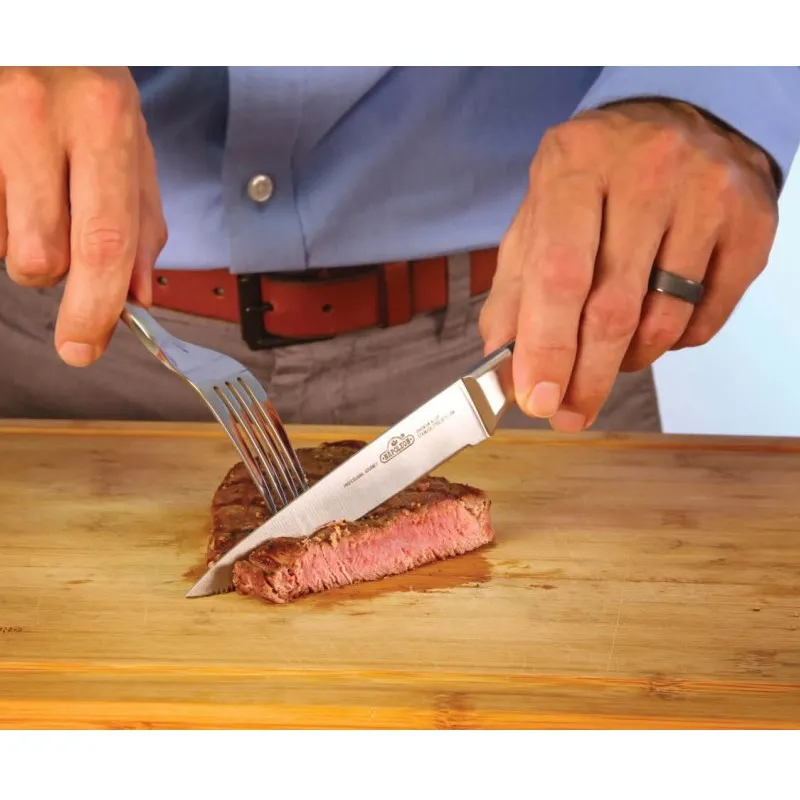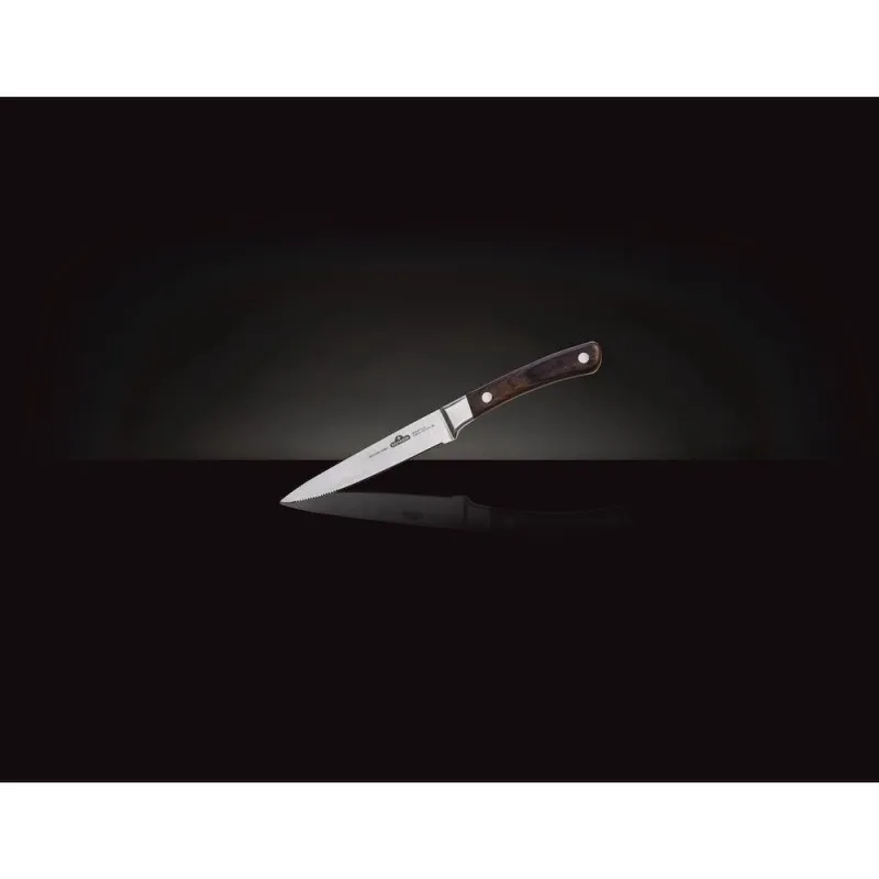 Нож для стейка с зазубринами от Наполеона и длиной лезвия 12,7 см может даже больше: нож оптимально сбалансирован, удобно и надежно лежит в руке и легко скользит по приготавливаемой на гриле пище. Две разные зоны резки обеспечивают идеальный рез: зона пилы обеспечивает точный контакт, а гладкое лезвие без усилий оставляет прямой рез. Нож для стейка оснащен клепаной ручкой из палисандра и впечатляет элегантным дизайном.