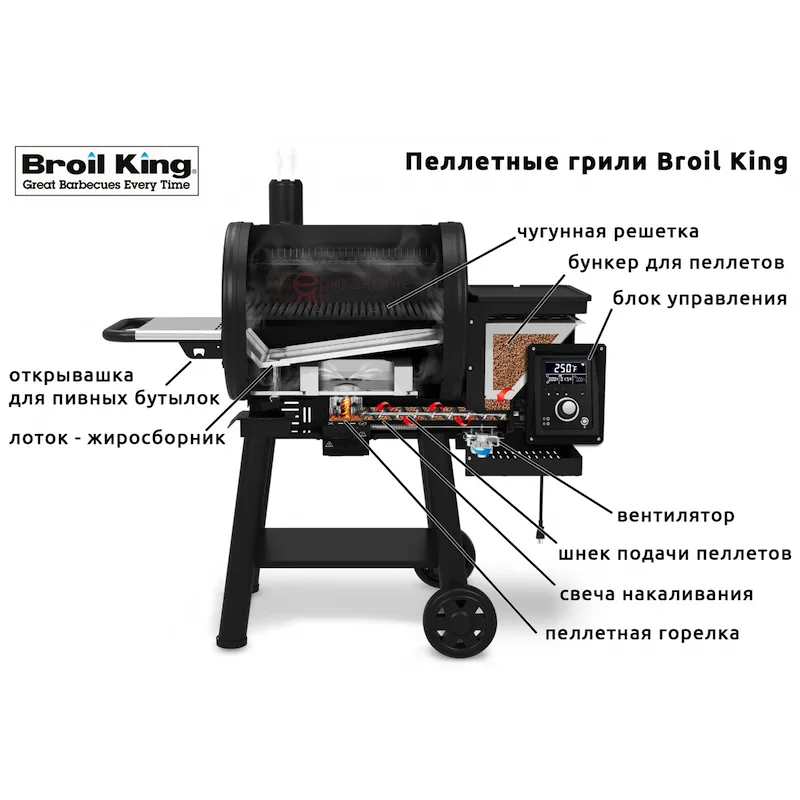 Гриль Броил Кинг имеет контроллер со встроенным таймером, оснащен двумя датчиками температуры и тремя кнопками быстрой настройки температуры - Smoke, Roast, Grill.