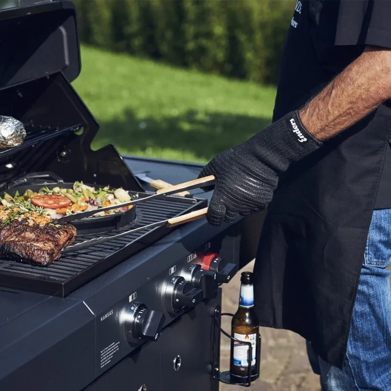Удобные огнестойкие защитные перчатки. Защищают руки от высокой температуры и загрязнений во время работы с грилем. Материал изготовления - арамид имеет выдающиеся эксплуатационные качества такие как: устойчивость к механическим воздействиям и крепость на разрыв сравнимые со сталью, термо и огнеустойчивость (не теряет своих качеств при температуре до 400 °С, выдерживает кратковременное нагревание до 1000 °С), биоустойчивость (ткани не страшны грибки и бактерии - не гниет и не впитывает неприятные запахи). Из арамидных тканей изготавливают боевую форму пожарников, металлургов, сварщиков и в любых отраслях где необходима огнезащита.
