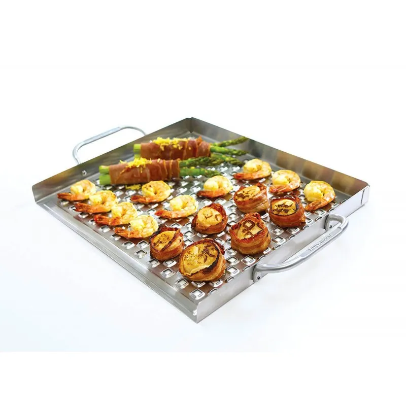 Квадратные перфорационные отверстия на дне противня повышают жесткость конструкции, предотвращая прилипание пищи. Это отличный аксессуар для барбекю, который оценит каждый владелец профессионального гриля.