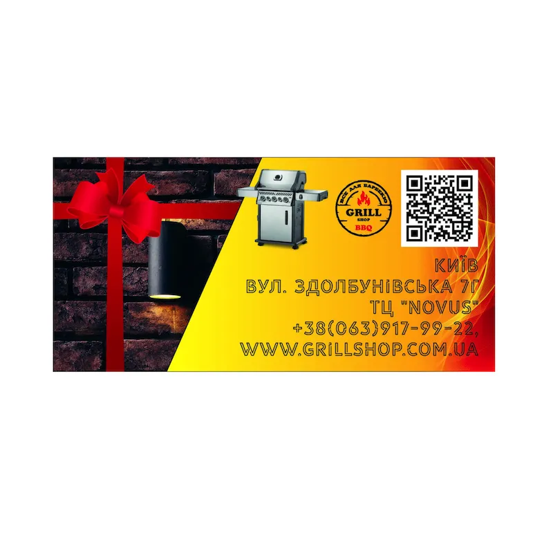 - Подарочный сертификат «GRILL SHOP» - это Карточка, на лицевой стороне которой указан номинал подарочного сертификата. Номинал подарочного сертификата указывается в гривнах.