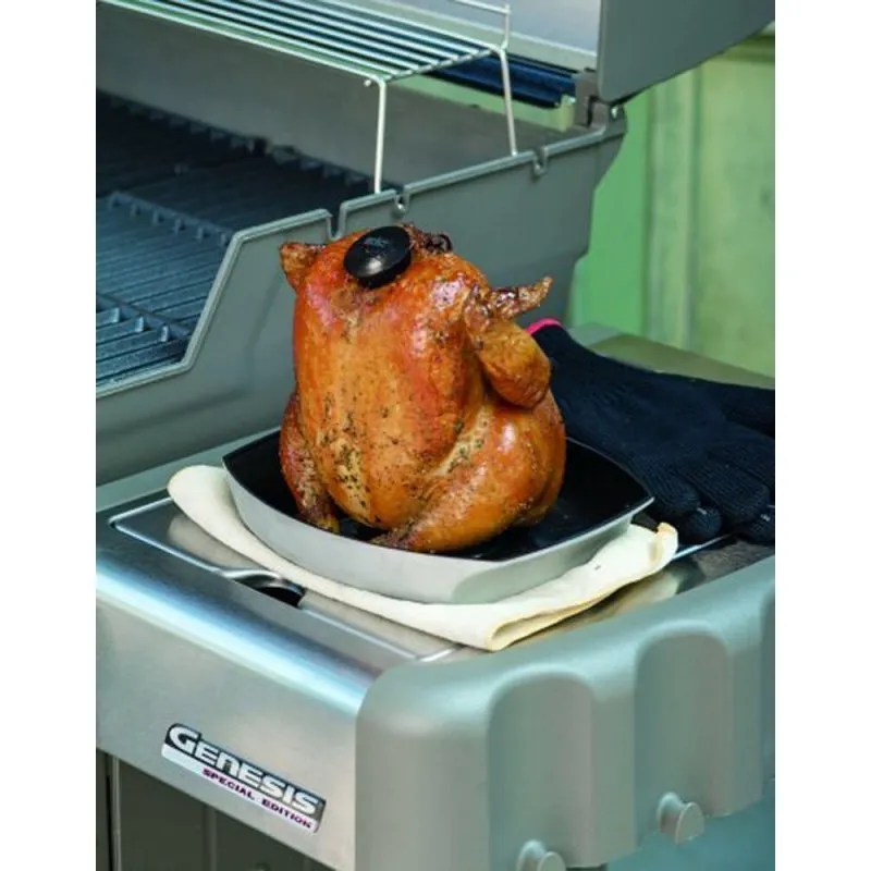 Ростер для гриля Weber Style сохранит аромат и сочность любой птицы, которую вы готовите на гриле. Просто налейте пиво, сок или вино в центральную чашку, а затем установите на нее конус ростера. Конус удерживает птицу в вертикальном положении, что позволяет сокам стекать на дно ростера, чтобы потом использовать из в качестве подливки. После этого поместите колпачок на тушку сверху чтобы пар из центральной чашки не выходил наружу и пропитывал птицу изнутри. Экспериментируйте с различными типами жидкостей для ростера, и вы будете удивлены какие разные оттенки вкуса можно получить. Антипригарное покрытие ростера позволяет мыть его в посудомоечной машине. Подставка для курицы (ростер)сделана из стали с тефлоновым покрытием. Конструкция ростера позволяет наливать маринад (вино, пиво или любую жидкость по вашему выбору) и пропитывать птицу изнутри. При нагреве жидкость закипает и циркулирует внутри птицы, в то время как снаружи мясо запекается. Результат - вкусное и сочное блюдо. Все элементы выполнены из литого алюминия с керамическим покрытием. Керамическое покрытие облегчает чистку и уход. Ростер подходит для угольных грилей 57см газовых грилей Spirit Genesis и Summit. Ростер можно использовать не только совместно с грилем, но и в cочетании с обычной духовкой.