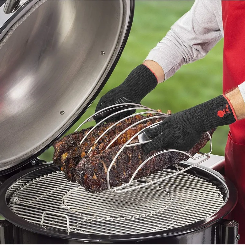 Вебер подставка для ребер имеет уникальную конструкцию два в одном, которая существенно расширяет сферу применения аксессуара. В то же самое время она позволяет минимизировать пространство и сэкономить средства. Если повернуть подставку с одной стороны, то на нее можно положить большой кусок стейка, а если с другой, то в вашем распоряжении будет отличный держатель для ребрышек.