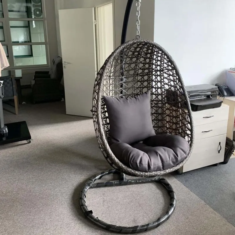 Удобное подвесное кресло из искусственного ротанга темно-серого цвета с двумя бежевыми подушками.