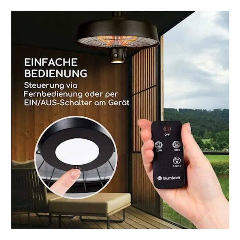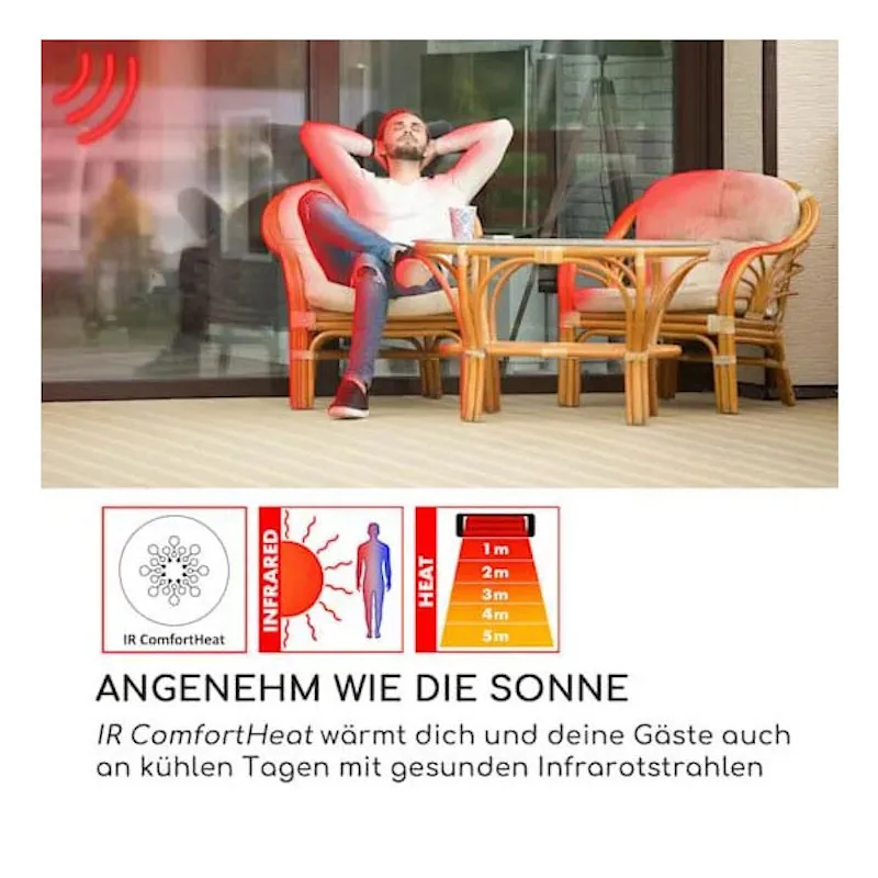 В комплект поставки входит усиленная стальная цепь, при помощи которой можно прикрепить обогреватель Blumfeldt Camden Heat Deluxe к потолку либо к любой горизонтальной перекладине, подвесив его, например, над обеденным столом Вашей террасы или летней площадки. Одним пультом ДУ можно управлять сразу несколькими обогревателями. Blumfeldt Camden Heat Deluxe работает бесшумно и уже через минуту нагревается до рабочей температуры, создавая мягкое и комфортное тепло подобное солнечному. Важной особенностью инфракрасного волнового излучения является то, что оно имеет направленный характер и, в отличие от конвекционного обогрева, нагревает не воздух, а предметы и людей, находящихся в радиусе действия. При этом сквозняки или холодный воздух не сдувают инфракрасные волны и не влияют на интенсивность обогрева. Поэтому во всем мире инфракрасные обогреватели в основном применяются именно в условиях улицы. Инновационные карбоновые нагревательные элементы, которыми оснащены обогреватели Blumfeldt Camden Heat Deluxe, генерируют ик-волны среднего диапазона, и в отличие от галогеновых обогревателей, создают более приятное проникающее тепло, напоминающее тепло от камина. Лампы из карбона имеют КПД - 90% и обладают высокой надежностью - минимальный гарантированный срок их работы – 5 000 часов.