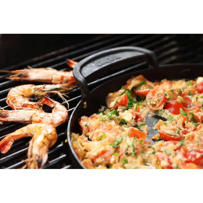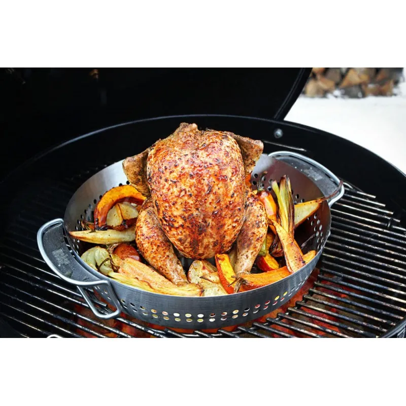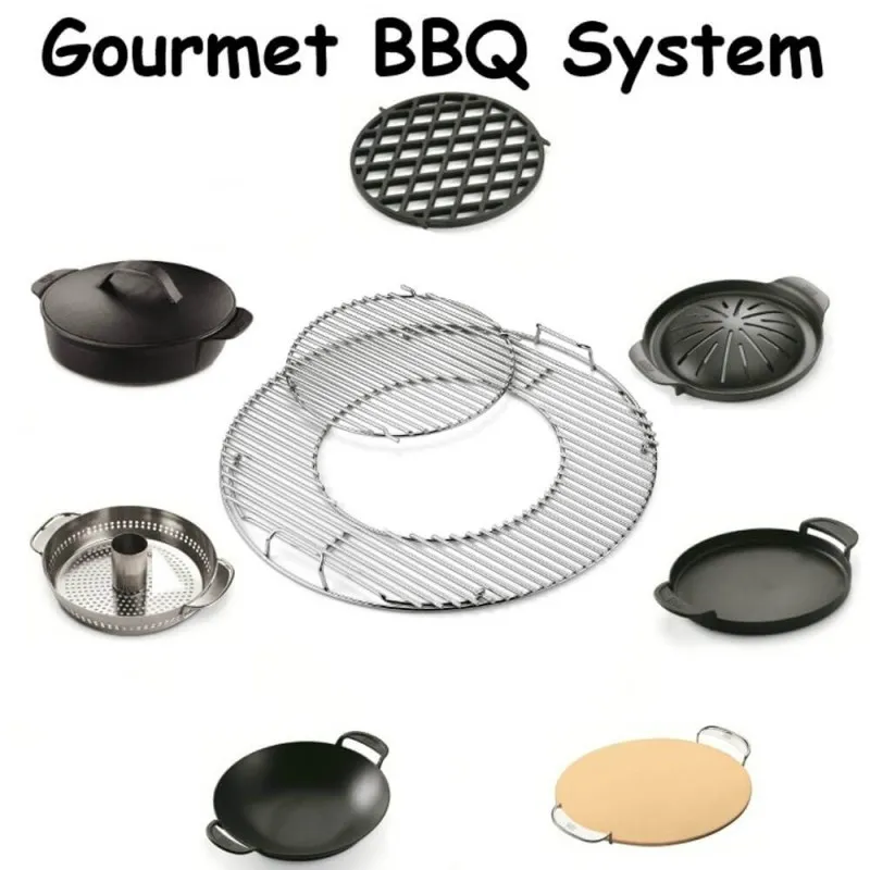 Gourmet BBQ System - это решетка из двух частей со сменной вставкой для аксессуаров из чугуна и нержавеющей стали: стейковой решетки, сковороды, казана-вок, подставки для курицы и овощей, круг для выпечки. Каждый из этих элементов можно разместить непосредственно на решетке. Решетка подходит для угольных грилей диаметром 57 см и может быть приобретена в качестве дополнительного аксессуара. Угольные грили Master-Touch 57, Perfotmer Original GBS 57, Performer Deluxe GBS 57 уже укомплектованы решеткой Gourmet BBQ System.