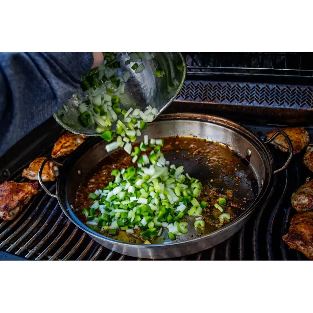 Наполните кастрюлю из нержавеющей стали бульоном, пивом, вином или соком, накройте крышкой и добавьте ароматический конус. Отверстия в конусе направляют вкусный пар внутрь курицы, а картофель и овощи готовятся на вкладыше крышки. Капающий соус придает жидкости восхитительный аромат и служит основой для восхитительного соуса. Практично: большую сковороду из нержавеющей стали можно использовать отдельно — для всех видов блюд на гриле и запеченных блюд, от яичницы до нарезанного мяса.