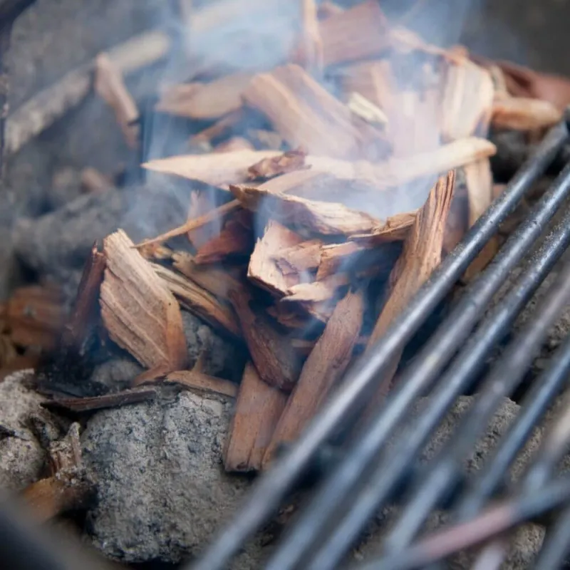 После замачивания, щепа слегка отжимается руками и бросается, небольшой горстью на угли. Затем, закрывается крышка гриля и выполняется регулировка вентиляционных отверстий.