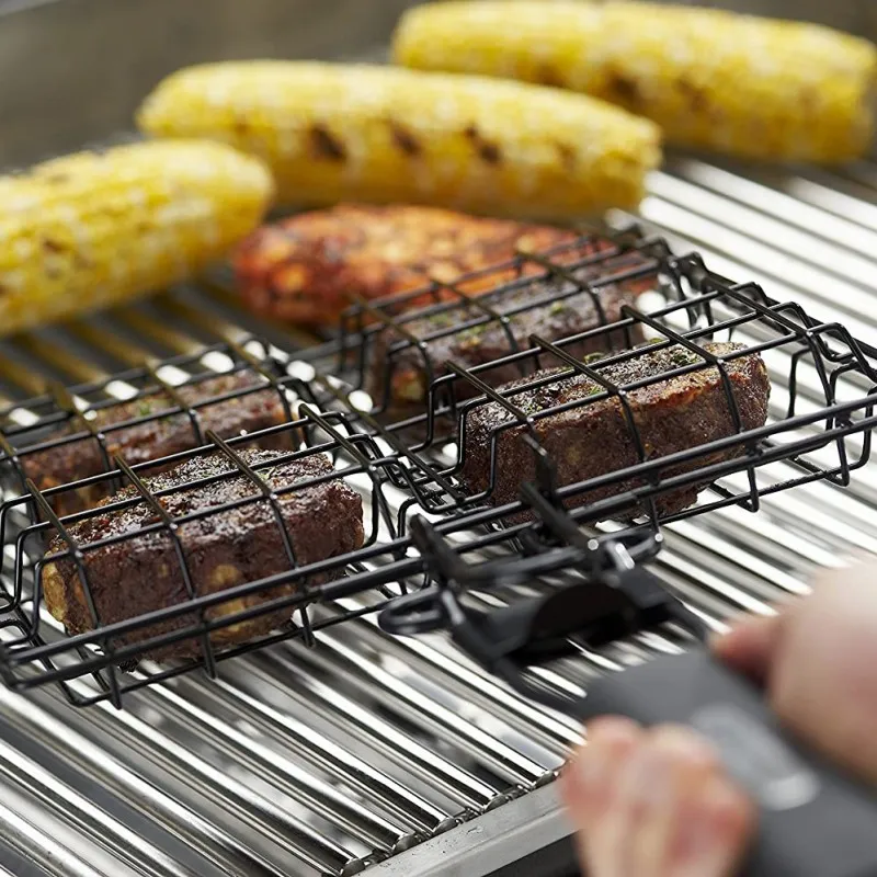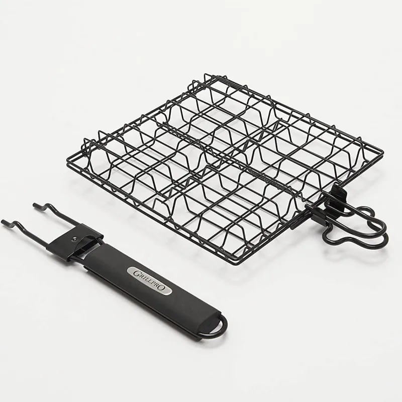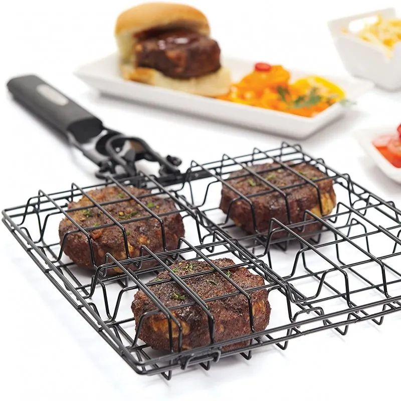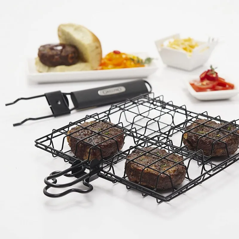 Сетка для бургеров имеет антипригарное покрытие и легко моется. Предназначена для приготовления четырех больших гамбургеров одновременно. Снабжена фиксатором с замком и съемной мягкой ручкой.