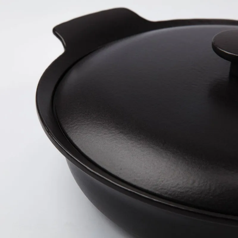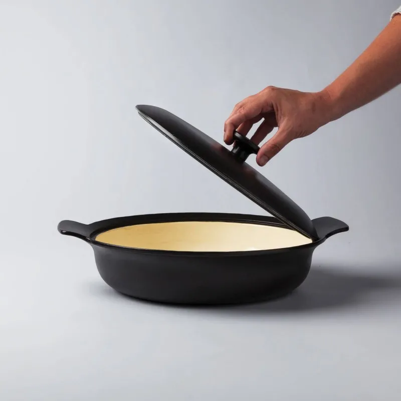 Сотейник изготовлен из чугуна, который великолепно сохраняет тепло. Внутри эмалированное покрытие. Во время приготовления ручки могут нагреваться. Рекомендуется пользоваться прихватками. Подходит для эксплуатации на всех типах плит, а также в духовом шкафу. При использовании в духовке температура не должна превышать 250 градусов. Не рекомендуется мыть в посудомоечной машине.