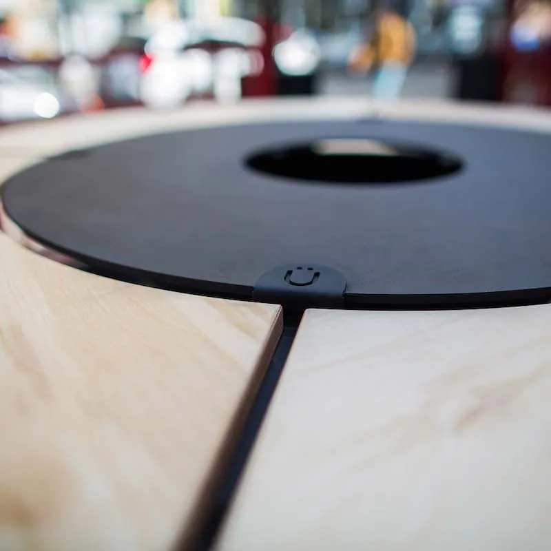 Конструкция стола представляет из себя четыре массивные столешницы из ясеня, толщиной 21 мм, соединенные между собой стальными кронштейнами, со специальным усилением. На поверхность фанерных элементов нанесен пятислойный полимерный защитный слой лака. На поверхность кронштейнов нанесено полимерное кремнийорганическое покрытие, стойкое к долговременному нагреву.