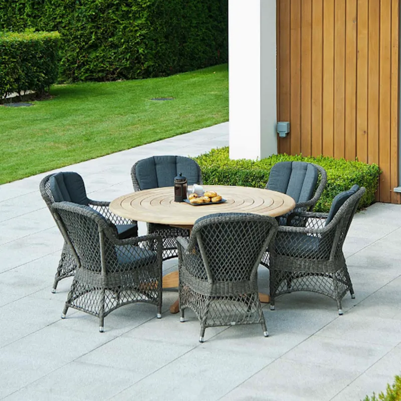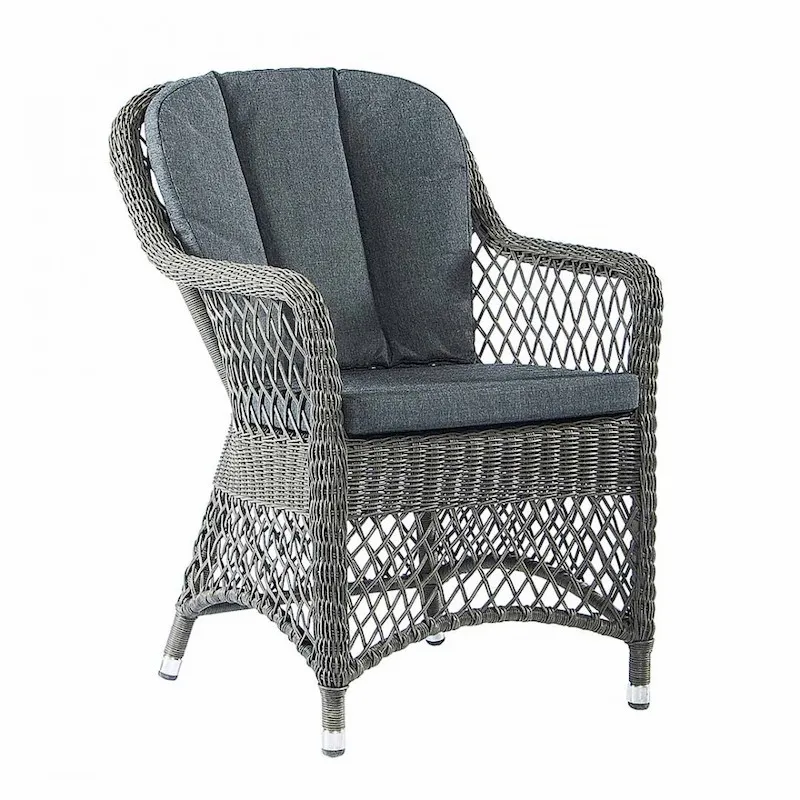 Изящество и комфорт cтoловой коллекции Monte Carlo (стол Monte Carlo диаметром 150 см и 6 обеденных кресел Monte Carlo Open Wave), созданной английскими дизайнерами не оставит равнодушным даже самого требовательного покупателя. Ажурное плетение 3-х мм круглой, текстурированной нити искусственного ротанга создает естественное ощущение. Мягкие линии, удобная посадка, безупречный внешний вид и водонепроницаемые подушки. Ротанговая мебель - стильное и практичное решение для обустройства открытой площадки, патио или сада. Мебель, сделанная из искусственного ротанга, характеризуется высокой устойчивостью к влиянию плохих погодных условий. Изделия из искусственного ротанга можно оставлять под открытым небом в любую погоду и даже зимой, не переживая за их внешний вид. Прочный и надежный каркас из алюминиевой трубы устойчив к ржавчине и имеет небольшой вес.