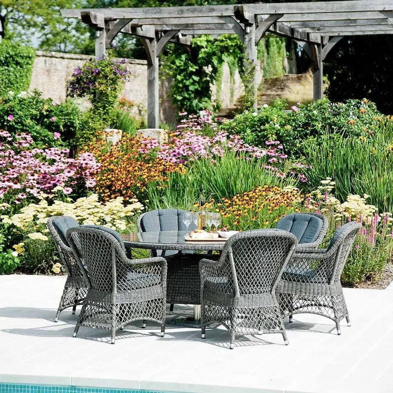 Изящество и комфорт cтoловой коллекции Monte Carlo (стол Monte Carlo диаметром 180 см и 6 обеденных кресел Monte Carlo Open Wave), созданной английскими дизайнерами не оставит равнодушным даже самого требовательного покупателя. Ажурное плетение 3-х мм круглой, текстурированной нити искусственного ротанга создает естественное ощущение. Мягкие линии, удобная посадка, безупречный внешний вид и водонепроницаемые подушки. Ротанговая мебель - стильное и практичное решение для обустройства открытой площадки, патио или сада. Мебель, сделанная из искусственного ротанга, характеризуется высокой устойчивостью к влиянию плохих погодных условий. Изделия из искусственного ротанга можно оставлять под открытым небом в любую погоду и даже зимой, не переживая за их внешний вид. Прочный и надежный каркас из алюминиевой трубы устойчив к ржавчине и имеет небольшой вес.