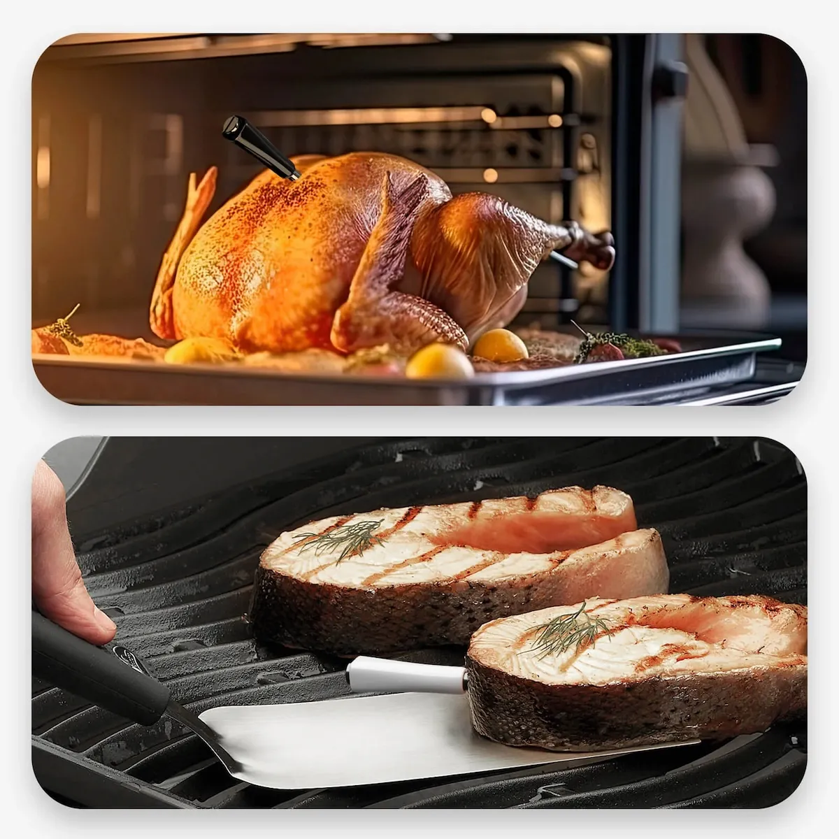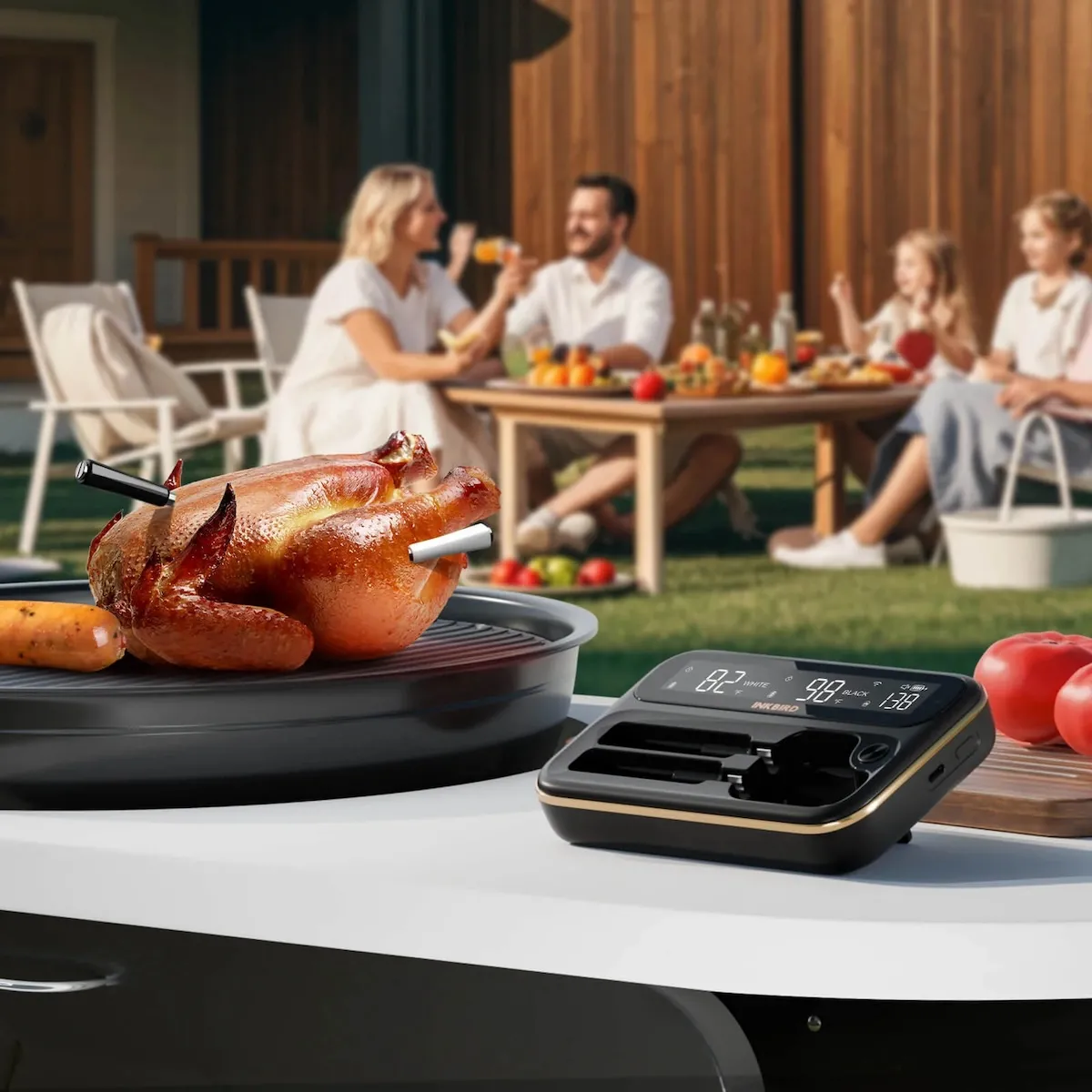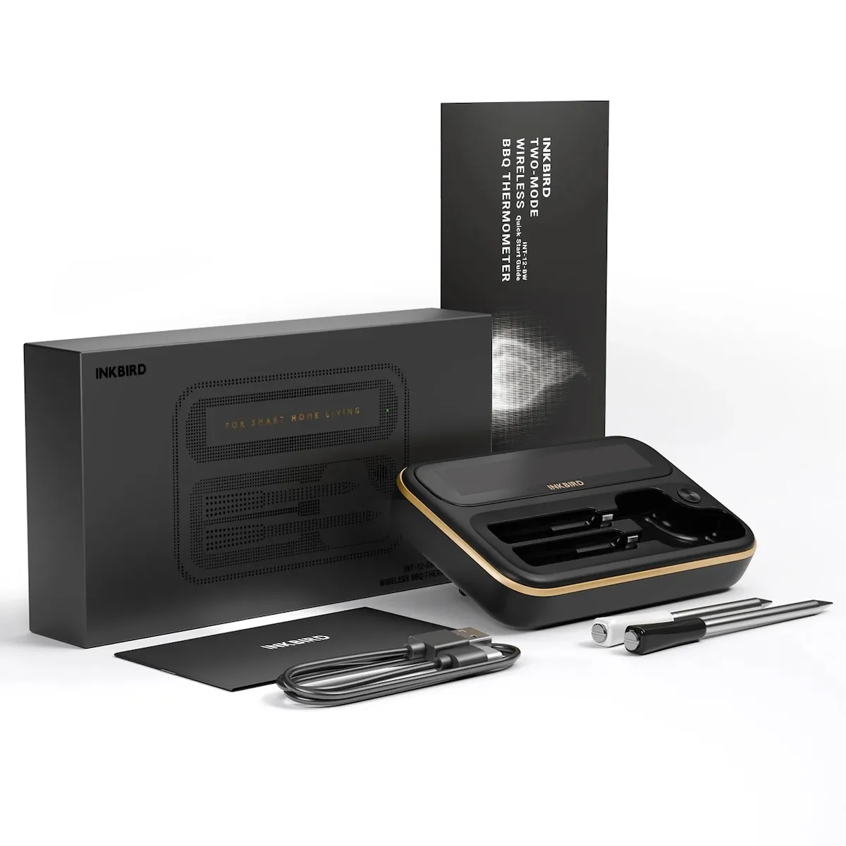 INKBIRD INT-12-BW — это беспроводной термометр, сочетающий в себе универсальность и высокую точность, оснащенный длинным и коротким зондами для различных кулинарных задач. Длинный черный зонд идеально подходит для запекания больших кусков мяса, позволяя одновременно контролировать внутреннюю и окружающую температуру, тогда как короткий белый зонд оптимален для меньших кусков и деликатных блюд. Термометр поддерживает WiFi 5G и Bluetooth 5.4, что обеспечивает удаленный мониторинг и делает процесс приготовления — от гриля до повседневных блюд — более удобным и приятным. Вы можете контролировать температуру дистанционно, не возвращаясь постоянно к грилю или духовке, что особенно ценно во время барбекю или домашнего приготовления.