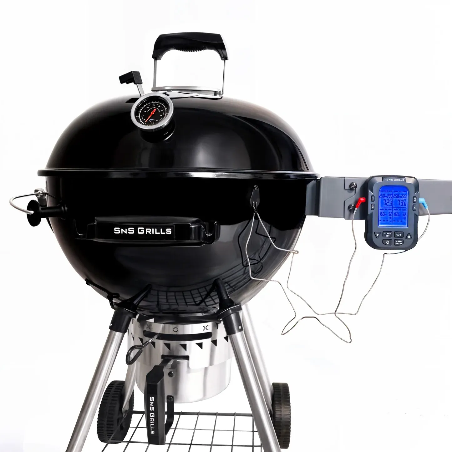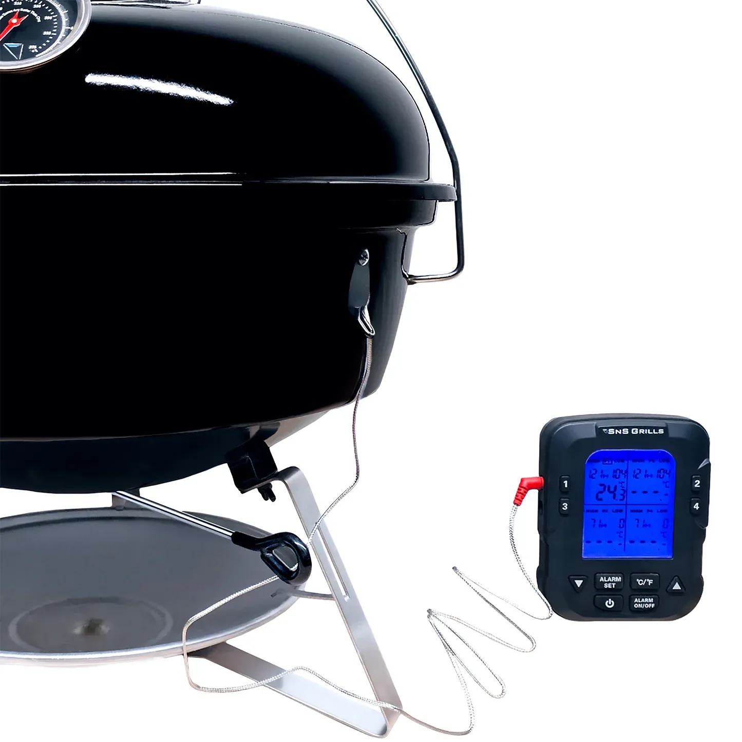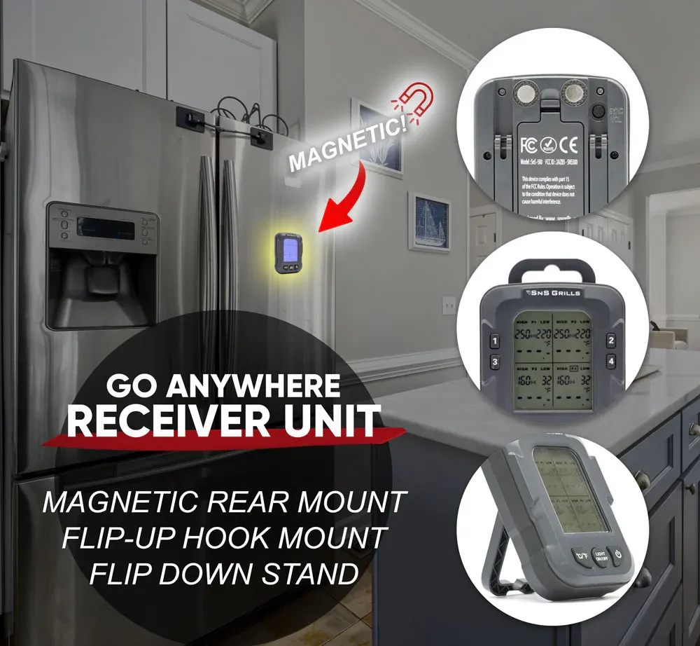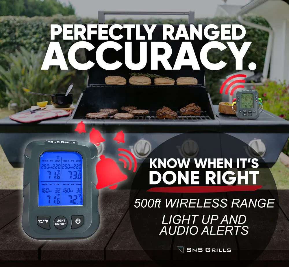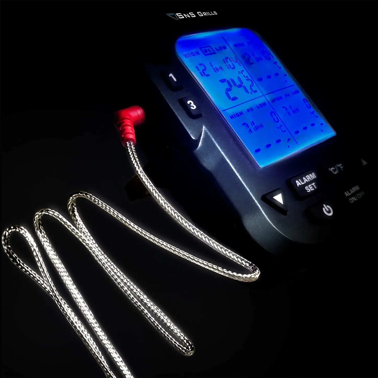 Цифровой термометр с подключением до 4 щупов. Удобная станция для удалённого контроля гриля с рядом важных преимуществ. Цифровой термометр от SnS для дистанционного считывания температуры мяса и других гриль-деликатесов. Два модуля — передатчик и приёмник, впечатляющая рабочая дистанция до 150 м, контроль до 4 щупов, яркие экраны и удобные кнопки, калибровка и тонкая настройка для ваших блюд и вдобавок фонарик для работы ночью.