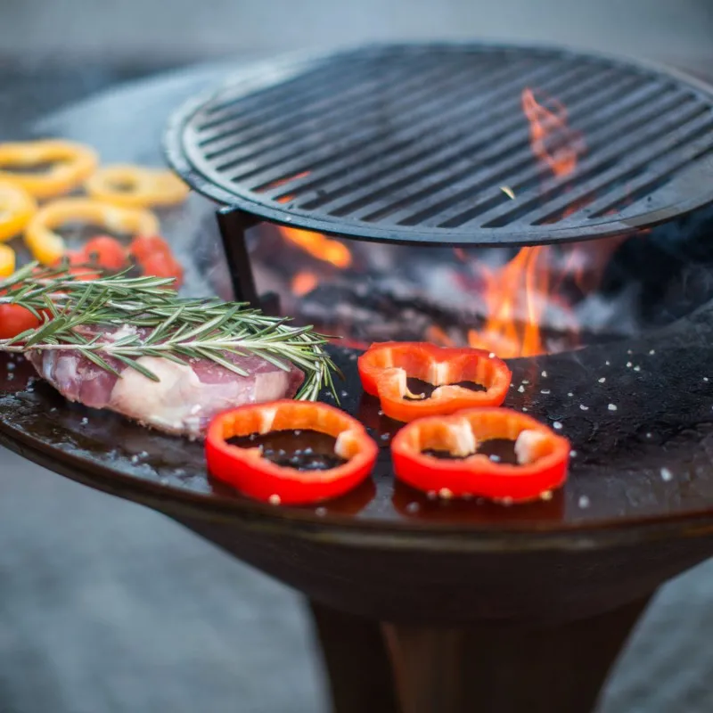 Круглий гриль AHOS складається з трьох частин: чаші топки, диска-поверхні для смаження і ніжки. Чаша виготовлена з імпортної сталі марки S235JR, її форма продумана таким чином, щоб рівномірно розподіляти тепло по поверхні для смаження. Поверхня для смаження з товстої вуглецевої сталі товщиною 8 мм володіє чудовою теплоємністю. Вкрита органічним багатошаровим антипригарним покриттям, що перешкоджає прилипанню їжі навіть при дуже високих температурах, вона дозволяє готувати практично будь-які страви, від яєчні до стейків, від овочів гриль до млинців.