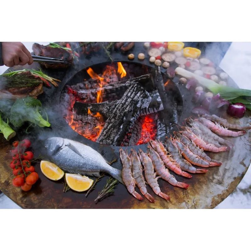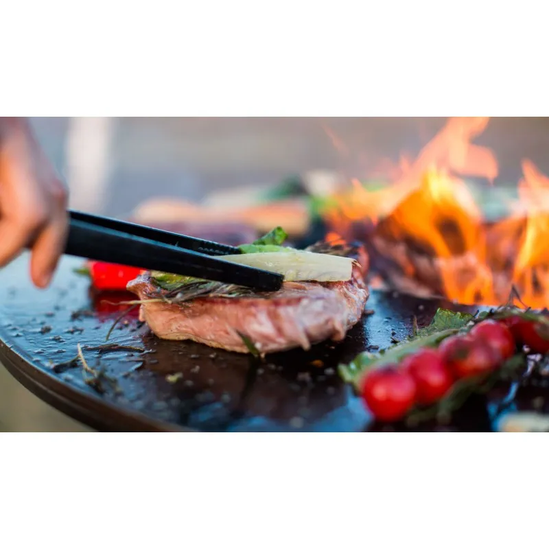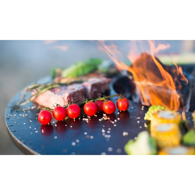 Круглий гриль AHOS складається з трьох частин: чаші топки, диска-поверхні для смаження і ніжки. Чаша виготовлена з імпортної сталі марки S235JR, її форма продумана таким чином, щоб рівномірно розподіляти тепло по поверхні для смаження. Поверхня для смаження з товстої вуглецевої сталі товщиною 8 мм володіє чудовою теплоємністю. Вкрита органічним багатошаровим антипригарним покриттям, що перешкоджає прилипанню їжі навіть при дуже високих температурах, вона дозволяє готувати практично будь-які страви, від яєчні до стейків, від овочів гриль до млинців.