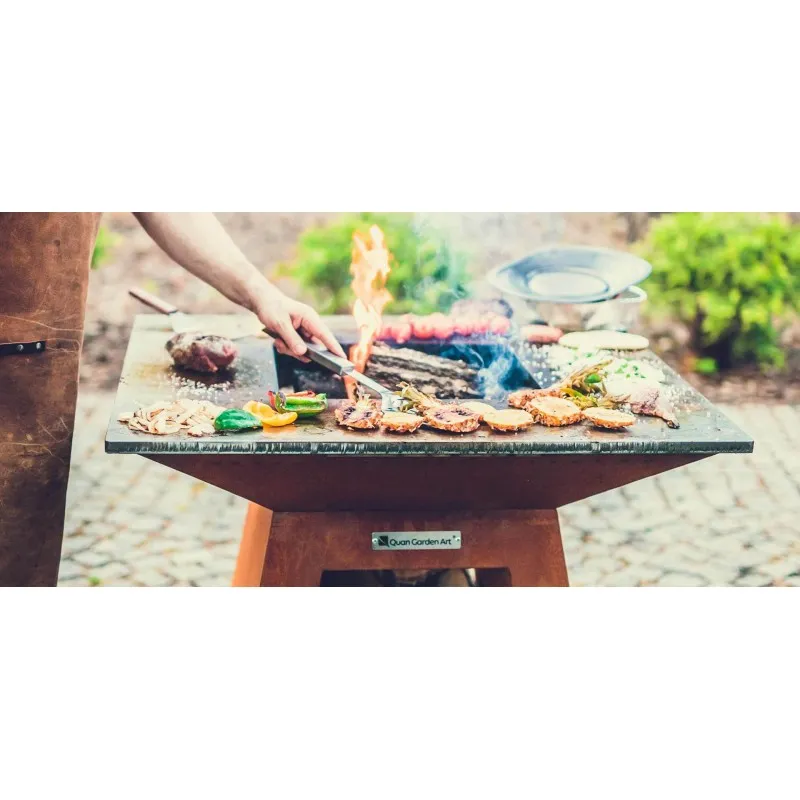 Розкішний гриль-вогнище Quan Quadro Basic Small острів з кортену від Quan Garden Art - це сучасний вуличний гриль і чаша для багаття, які привносять в сад нотку класності. Завдяки продуманій системі Quan Airflow Design і унікальній конструкції з якісних матеріалів цей високопродуктивний гриль дозволяє одночасно готувати і розважати. Цей багатофункціональний гриль зігріє ваших гостей до вечора що ідеально підходить для громадських заходів. Пластина для смаження виготовлена із загартованої сталі товщиною 10 мм що забезпечує відмінне приготування їжі. Регулювання повітряного потоку дозволяє легко контролювати вогонь для досягнення ідеальної температури приготування. Внутрішня чаша з нержавіючої сталі відділена від зовнішньої повітряниою кишенею, завдяки чому бічні стіни не перегріваються, що запобігає опікам. Товщина матеріалу конструкції гриль-вогнища - 1,5 мм.