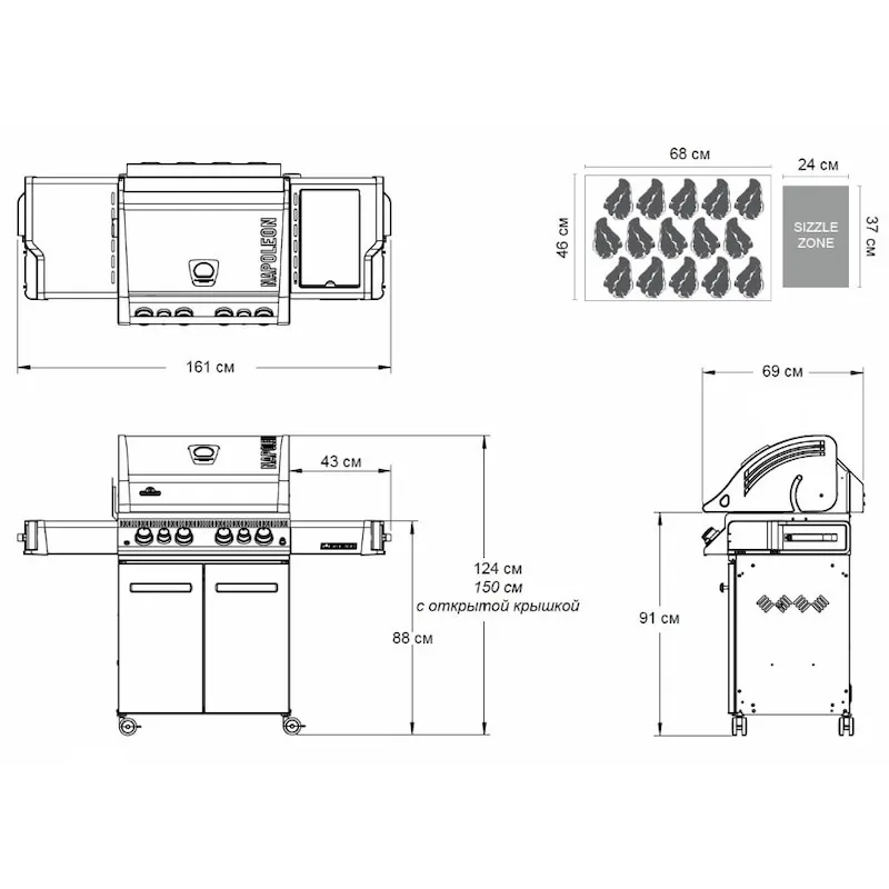 - площа для смаження: основна решітка - 68 х 46 см, решітка для підігріву - 68 х 18 см, бічна пальник SIZZLE ZONE ™ - 24 х 37 см;