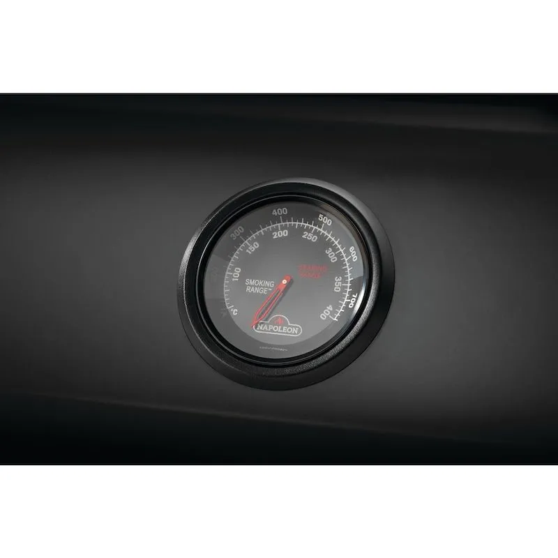 Термометри ACCU PROBE. Точний термометр ACCU PROBE від Napoleon вбудований у кришку та надійно показує внутрішню температуру газового грилю за шкалою до 400 °C. У моделі Napoleon Phantom F425 термометр та регулятори мають матово-чорне оздоблення.