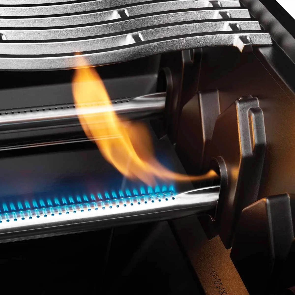 - пальники: 4 основні трубчасті пальники з нержавіючої сталі (16 кВт), бічний керамічний інфрачервоний пальник SIZZLE ZONE™ (5 кВт), задній інфрачервоний пальник для рожна з нержавіючої сталі (5,7 кВт);