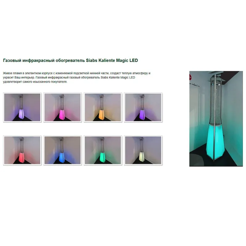 Газовий інфрачервоний обігрівач SIABS KALIENTE Magic LED з живим полум'ям в скляній колбі. Обігрівач SIABS KALIENTE поєднує інноваційний дизайн, зручність управління, функціональність і високу потужність обігріву. Модель Kaliente Magic LED випускається з автоматичним дистанційним управлінням, є регулювання потужності, змінне LED підсвічування RGB корпусу обігрівача.