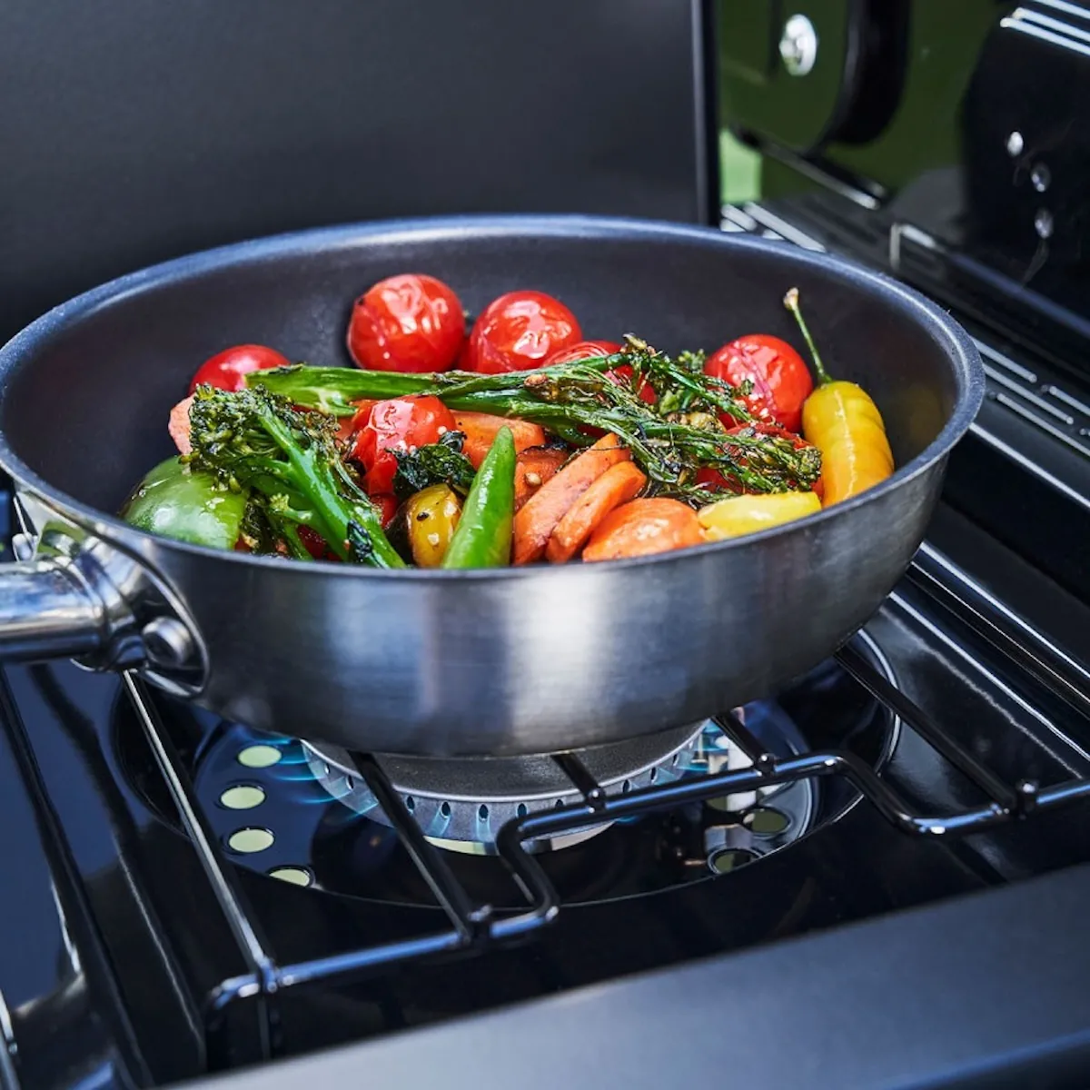 - Бічний пальник (3,5 кВт): Підігрівайте соуси та гарніри, щоб доповнити страви, приготовані на грилі, або опустіть кришку і використовуйте поверхню як додаткове робоче місце.