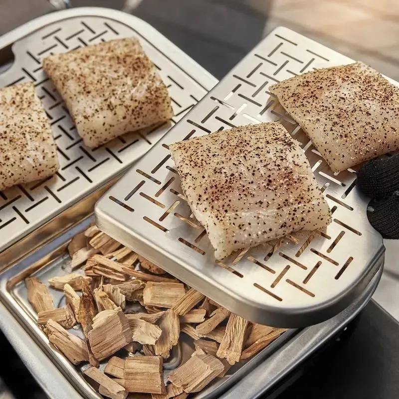 - Має функцію коптильні. Додайте тріску Weber до спеціального боксу та додайте своїй страві ефект копчення.