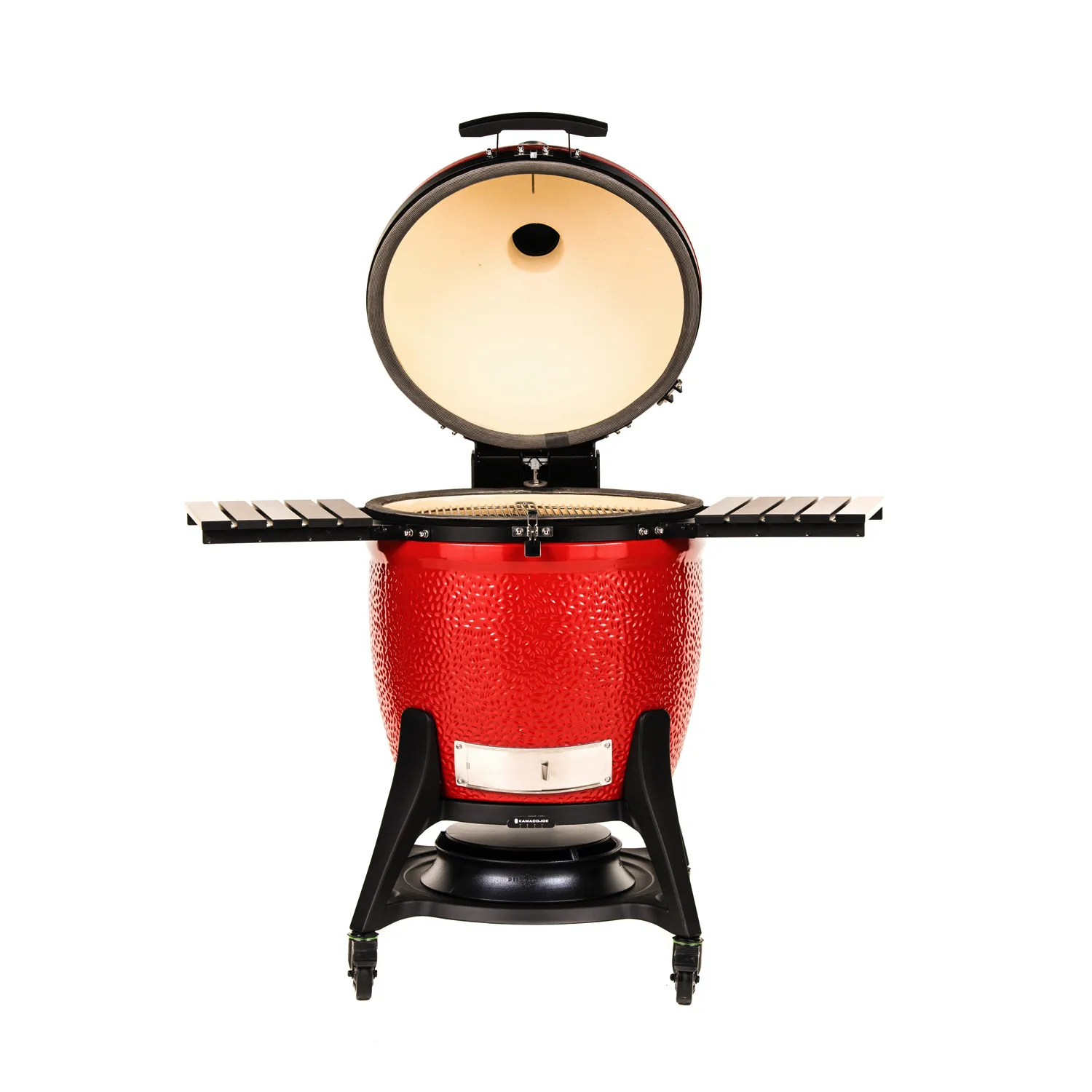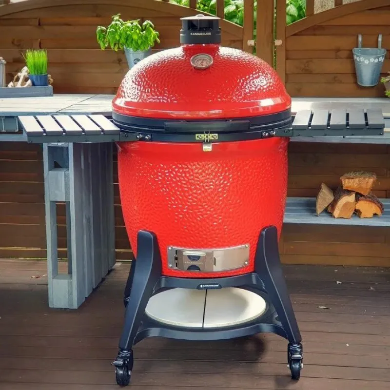Особливості конструкції та комплектація. Можливості та комплектація дозволяють замовити барбекю Камадо як для приватного володіння, так і професійного застосування. Він виконаний із термостійкої кераміки, яка покрита темно-червоною емаллю. Має практичну яйцеподібну форму і може забезпечувати нагрівання в діапазоні температур від 110 до 400 градусів.