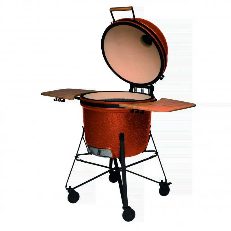 Великий керамічний вугільний гриль-піч типу " Камадо". Виготовлений з високоякісної кераміки, яка відрізняється повишеною міцністю і термостійкістю, завдяки чому гриль стійко витримує значні перепади температури. Контролювання притоку повітря виконується за допомогою регулятора тяги який знаходиться на верній частині купола грилю і піддувала, який розміщений в нижній частині корпусу. Завдяки рівномірному розподілу тепла в даному гриль-печі можна готувати страви будь-якої складності. В комплект гриля входить: решітка з нержавіючої сталі, бічні столики з крючками для аксессуарів і підставка під гриль на колесах.