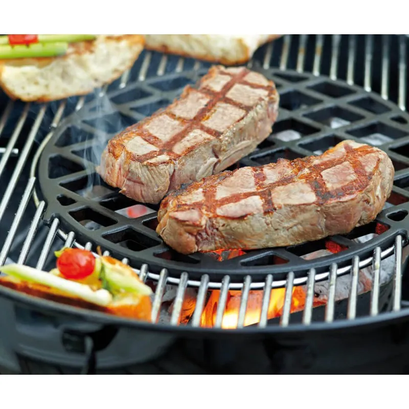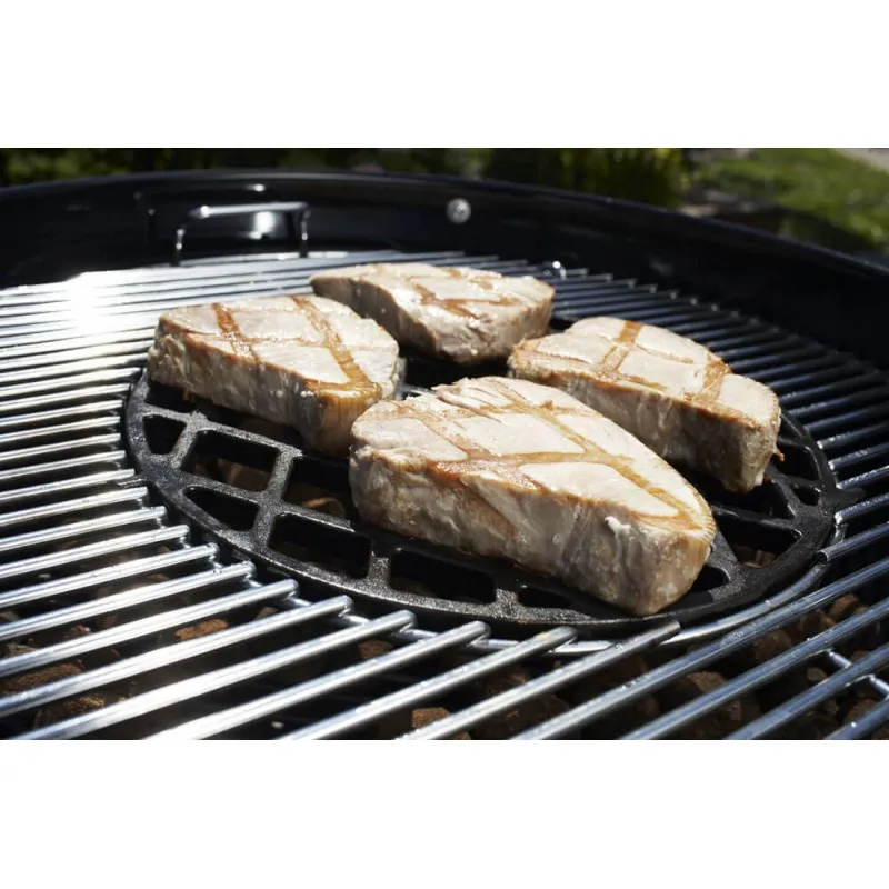 Стейкова решітка з чавуну - аксесуар для системи Gourmet BBQ System. Решітка дозволяє приготувати справжній стейк з характерними смужками. Не можна мити в посудомийній машині. Підходить для вугільних і газових грилів з модулем GBS чавунна решітка Sear Grate була спеціально розроблена для вугільних і газових грилів Weber, оснащених основною решіткою системи GBS® (Gourmet BBQ System) зі знімним центральним модулем. Обсмажуйте стейки або відбивні, щоб створити хрустку скоринку, зберегти соковитість і отримати чудовий візерунок. Sear Grate покрита антипригарною емаллю і ефективно розподіляє тепло по всій поверхні. Просто обсмажуйте їжу на решітці Sear Grate на прямому сильному жарі по 1-2 хвилини з кожного боку, а потім проведіть її в іншу частину основної решітки гриля, в зону непрямого жару, щоб довести її до готовності.