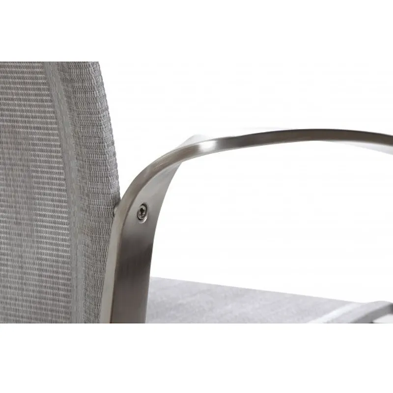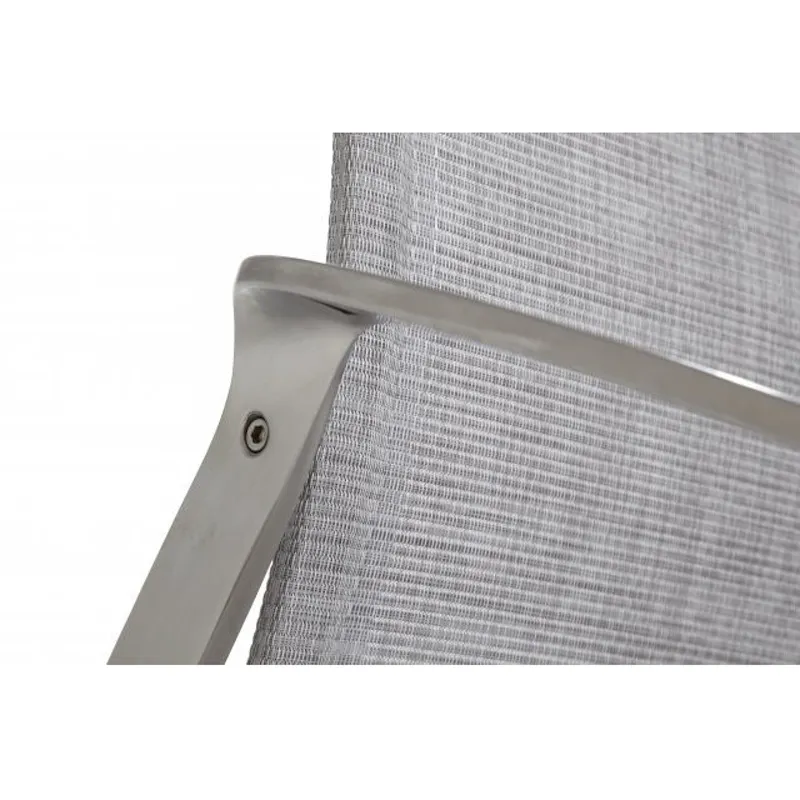 Каркас стільця виконаний з нержавіючої сталі, сидіння - текстилен. Текстилен - сітка з поліестерової нитки, покритої вінілом. Цей сучасний матеріал не вбирає вологу, пропускає повітря і швидко висихає, йому не страшні різні креми для засмаги. Основа вироби - дуже міцна і надійна сталева конструкція, яка прослужить довгі роки.