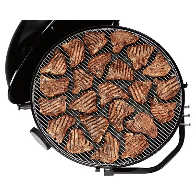- Фірмові грати з нержавіючої сталі преміум-класу довговічні, легко очищаються і мають шарніри для легкого додавання деревного вугілля під час приготування страви на грилі.