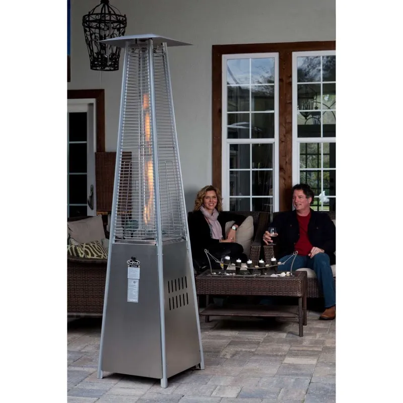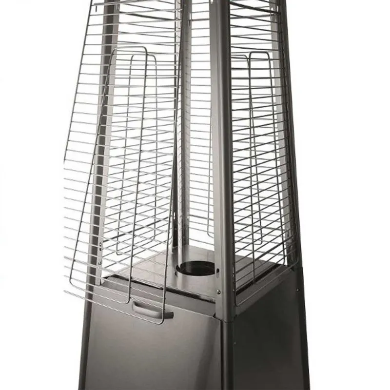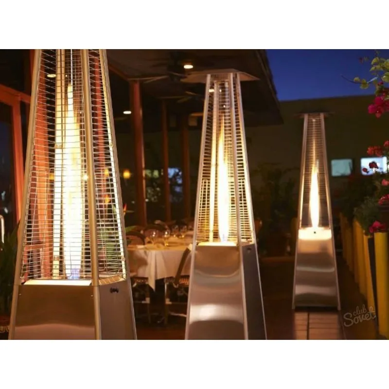 Вуличний газовий обігрівач Activa Pyramide Cheops - піраміда з полум'ям в корпусі, вище одного метра у висоту, являє собою воістину неймовірне видовище, він призначений для обігріву літніх майданчиків, терас, веранд і просто відкритих територій. Заворожлива гра вогню створює особливо затишну атмосферу на терасі або в саду. Цей оригінальний вуличний газовий обігрівач користується величезною популярністю в усьому світі. Газовий обігрівач виготовлений з нержавіючої сталі, що виключає вплив атмосферних опадів і пошкодження внаслідок корозії. У основі обігрівача можна сховати газовий балон об'ємом від 24 до 27 літрів, що робить обігрівач мобільним і дозволяє переміщати його в будь-яке необхідне місце. При цьому виробник рекомендує використовувати вибухобезпечні композитні газові балони європейського виробництва. Потужний пальник 10,5 кВт - здатна забезпечити теплом простір в діаметрі до 5 метрів.