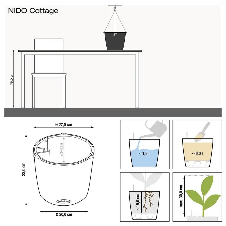 NIDO Cottage, підвісне кашпо від LECHUZA, швидко збирається і міцно висить на що постачається разом кріпленні з нержавіючої сталі. В якості альтернативи NIDO можна також розміщувати як настільний кашпо.