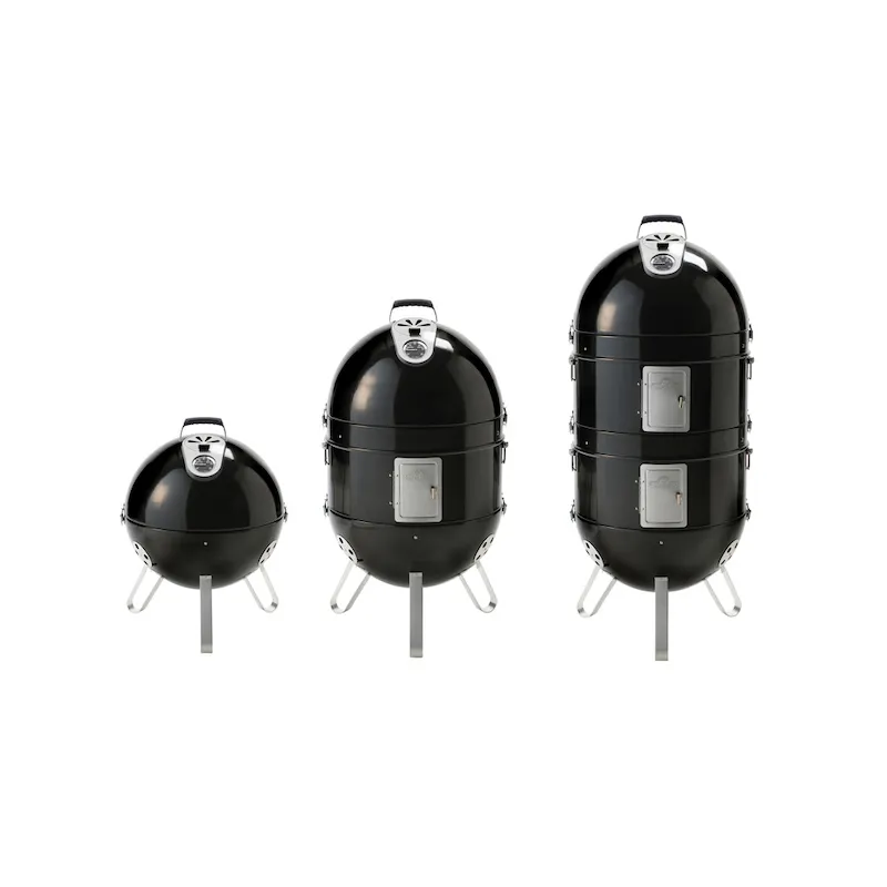 Гриль коптильня Наполеон имеет цилиндрический, вертикально вытянутый корпус с несколькими отсеками, установленный на невысоких ножках. Сверху имеется складная ручка, позволяющая легко переносить устройство с одного места на другое.