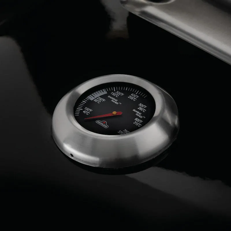 В крышку встроен термометр, контролирующий температуру готовки и предотвращающий сгорание пищи. Ручка на крышке имеет экран-отражатель с теплозащитными свойствами. Прочные колеса позволяют использовать гриль в любую погоду – толкать его можно даже в снег!