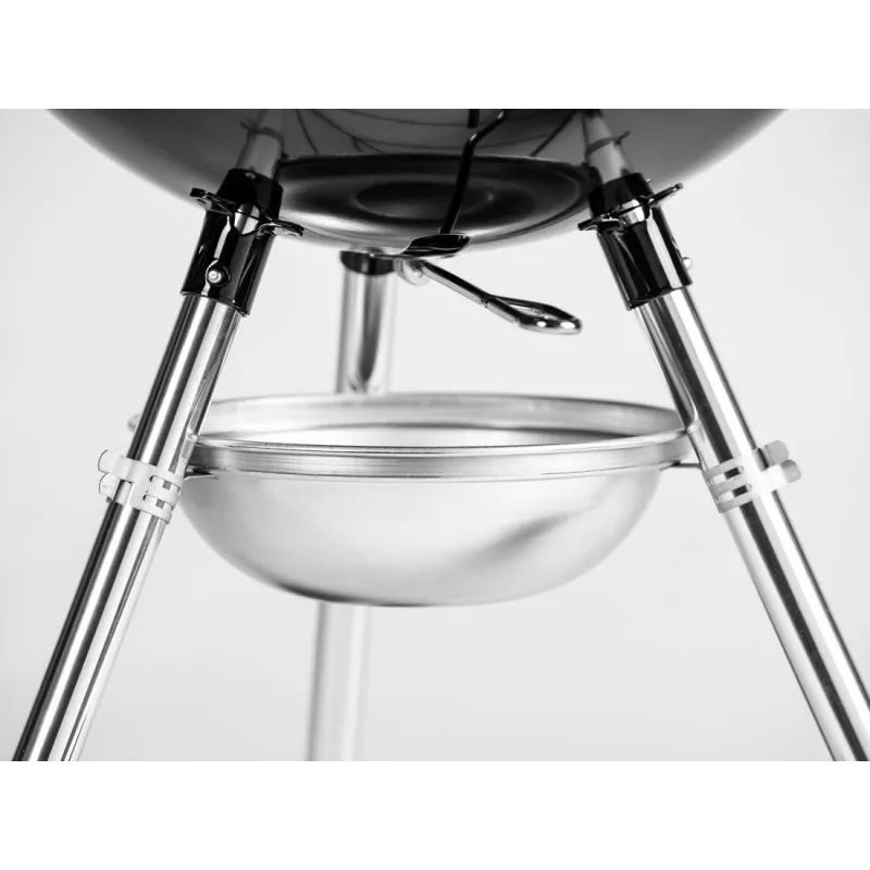 Система очистки в одно касание обеспечивает легкий уход и обслуживание. Это относится к стальной решетке с покрытием и практичному поддону для пепла, который легко снимается для опорожнения. Крышка и поднос имеют ручку из дюропласта, поэтому нет риска ожога, даже когда они горячие. Благодаря большим всепогодным колесам шар-гриль высотой 97 см можно легко перемещать. Приставных столиков нет, но есть крючки для посуды и инструмента.