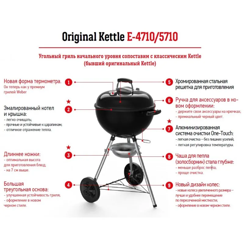 Угольный гриль Weber Original Kettle Е-4710 — отменный угольный гриль, который выполнен в соответствии с самыми требовательными стандартами качества. Дополнительное его преимущество еще и в том, что он укомплектован штатным термометром, а это позволяет существенно расширить рецептуру блюд, которые на нем можно приготовить. Купить угольный гриль Weber именно этой модели стоит ввиду его доступной стоимости, адекватных размеров и высокого качества сборки. При этом уголь для грилей можно использовать практически любой — результат все равно будет отменным. Этот легендарный гриль, изобретенный основателем компании Weber, теперь стал еще более удобным. Среди новых его преимуществ: удлиненные ножки, повышающие комфорт, улучшенная система очистки One-Touch с тарелкой-золосборником большой емкости, а также снабженная крючками ручка котла гриля. Классика барбекю с новым уровнем комфорта!