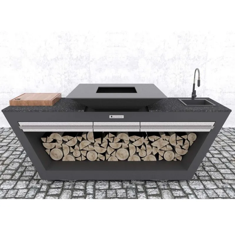 Превосходная кухня Quadro Premium Rolling Kitchen в карбоне от Quan Garden Art - это современный гриль и чаша для костра на открытом воздухе, которые привносят в сад нотку классности. Благодаря продуманной системе Quan Airflow Design и уникальной конструкции из качественных материалов этот высокопроизводительный гриль позволяет одновременно готовить и развлекать. Этот многофункциональный гриль согреет ваших гостей до вечера, что идеально подходит для общественных мероприятий. Rolling Kitchen - это полноценная летняя кухня на колесах. Гриль-кухня оснащенна дополнительным умывальником и водонагревателем, она удовлетворяет все потребности повара-барбекю на открытом воздухе. Эта передвижная кухня также включает в себя большую гранитную столешницу и место для хранения дров.