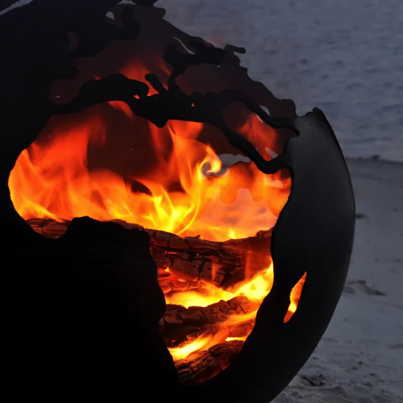 Украшением вашего участка легко может стать данная модель. Для любителей географических мотивов предлагаем очаг-шар, выполненный в виде глобуса. На стенках камина вырезаны очертания океанов и материков. Дополнительно возможно изготовление вращающейся подставки для глобуса. Рисунок может быть индивидуальным под заказ, так как каждый сюжет на шаре ТМ Prescona вырезается вручную. Подставка под очаг может быть в двух вариантах – в виде цилиндра или в виде корней деревьев.