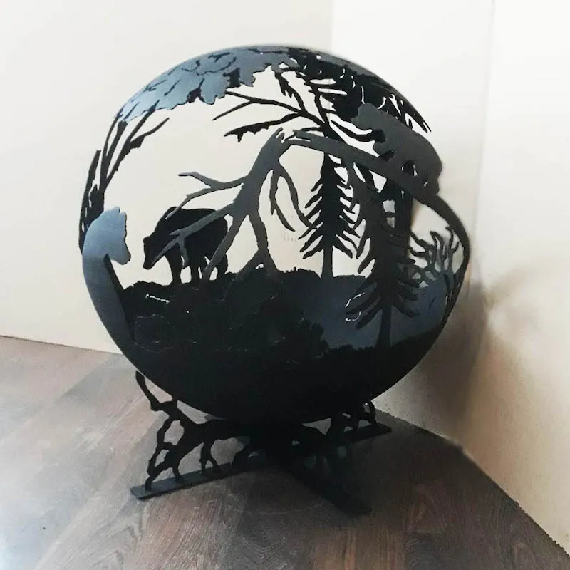Кованый камин представляет собой шар, изготовленный из жаропрочной черной стали, установленный на металлическую подставку в виде трубы или веток деревьев. На стенках изделия вырезаны оригинальные рисунки, из которых вылетают жаркие языки пламени. Снаружи и внутри на поверхность шара наносится черное термостойкое покрытие. Стандартно изготавливаются шары двух диаметров – 90 см и 50 см с толщиной металлической стенки 0,5 см.