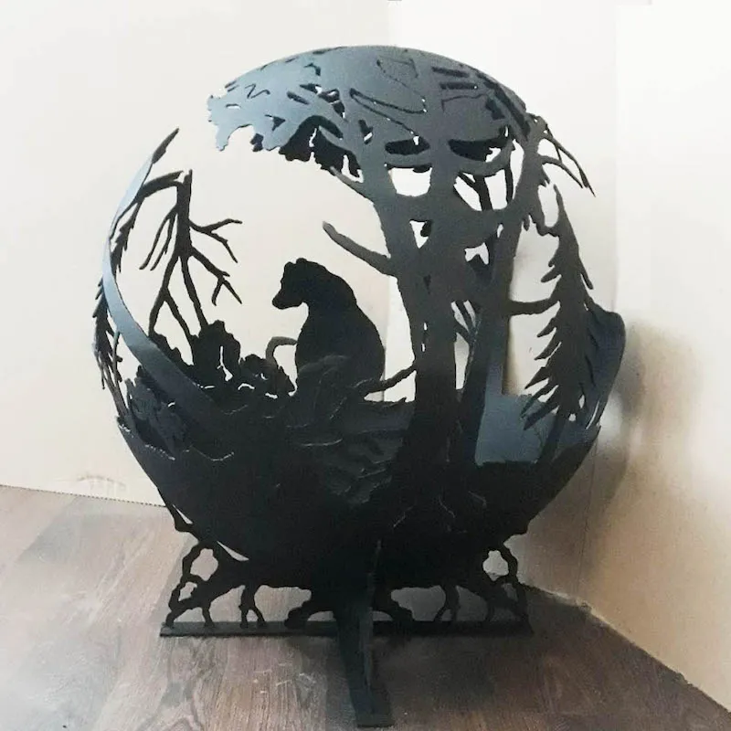 Украшением вашего участка легко может стать данная модель. Очаг представляет собой лесной пейзаж с медведями, такое оформление подойдет как любителям охоты, так и любителям животных. Рисунок может быть индивидуальным под заказ, так как каждый сюжет на шаре ТМ Prescona вырезается вручную. Подставка под очаг может быть в двух вариантах – в виде цилиндра или в виде корней деревьев.