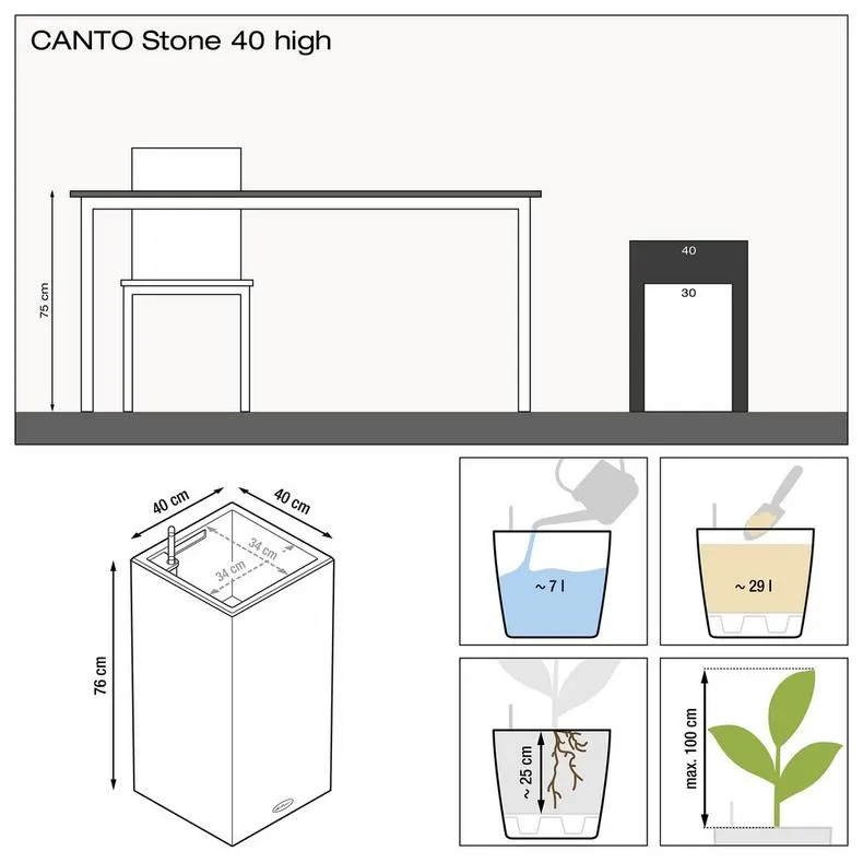 Любители четких линий по достоинству оценят кашпо CANTO Stone. Суровый вид натурального камня в трех цветовых тонах создает необычный контраст к насыщенно зеленому цвету растений. Благодаря единому размеру внутренний горшок для CANTO Stone может использоваться для кашпо в прямоугольной форме и в форме куба.