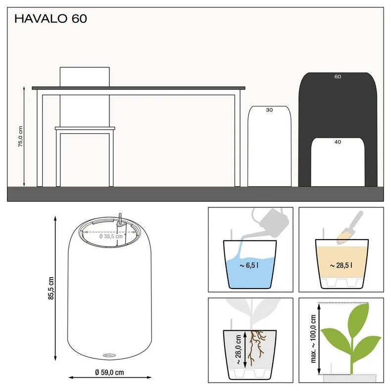 Роскошные модели HAVALO доступны в элегантных оттенках светло-серый, темно-серый и светло-бежевый и в размерах 30, 40 и 60. Комплект «все-в-одном» включает в себя кашпо, подкладку, индикатор уровня воды и субстрат LECHUZA-PON.