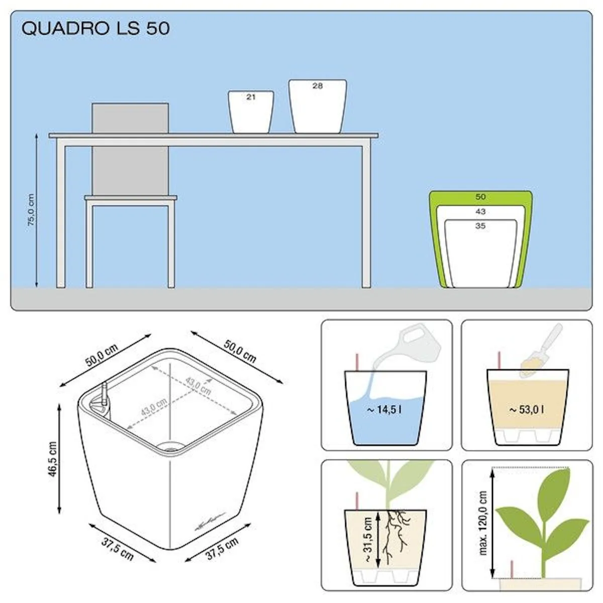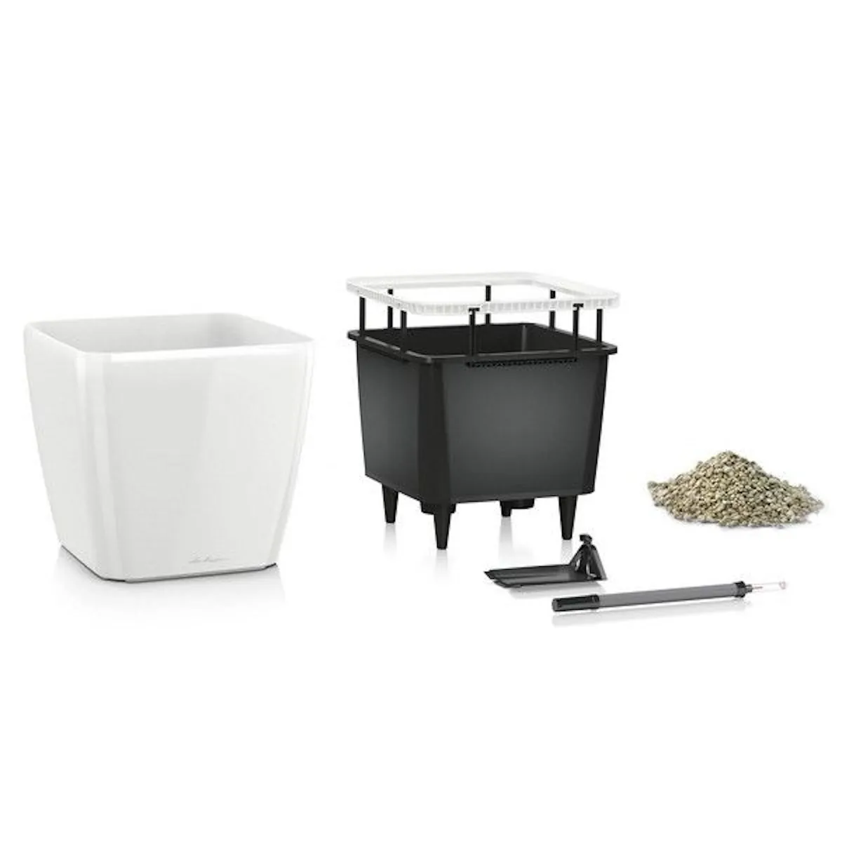 Элегантная ручка, окрашенная в цвет кашпо, входит во все наборы “Все в одном” размером 21 - 50. Она не только красиво смотрится, но и обеспечивает возможность легкой замены растений также в кашпо серии QUADRO.