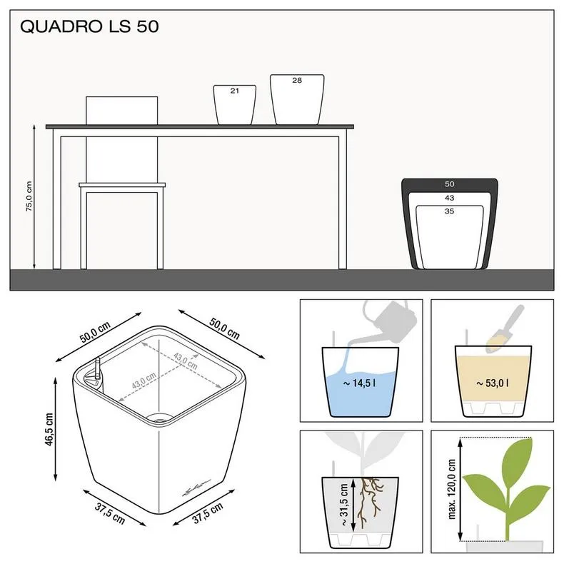 Элегантная ручка, окрашенная в цвет кашпо, входит во все наборы “Все в одном” размером 21 - 50. Она не только красиво смотрится, но и обеспечивает возможность легкой замены растений также в кашпо серии QUADRO.